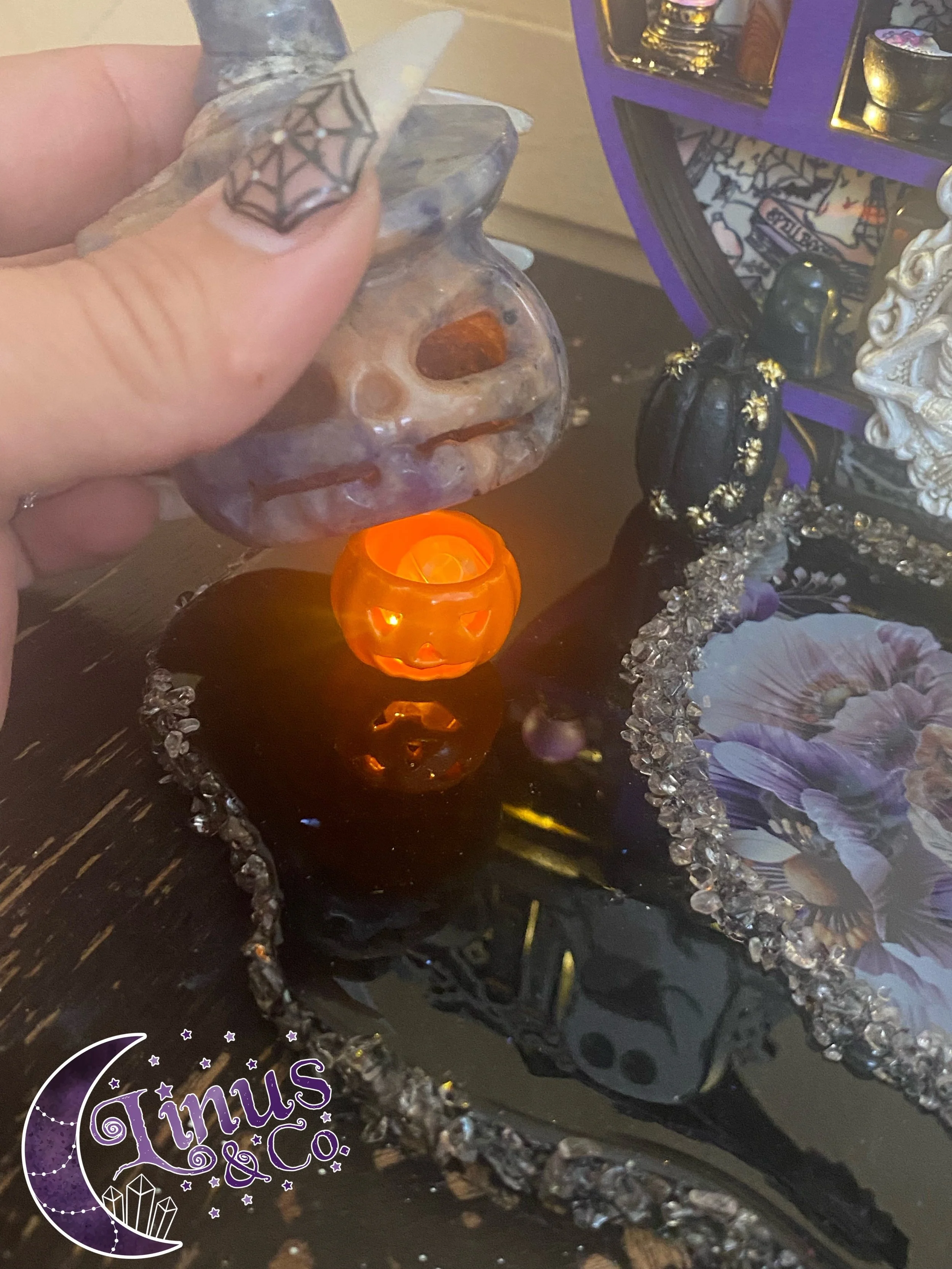 With an obsidian sphere, sodalite pumpkin, amethyst ghost, black Quartz points, Smokey Quartz chips, fluorite witch hat, ghost, raven and pumpkin.