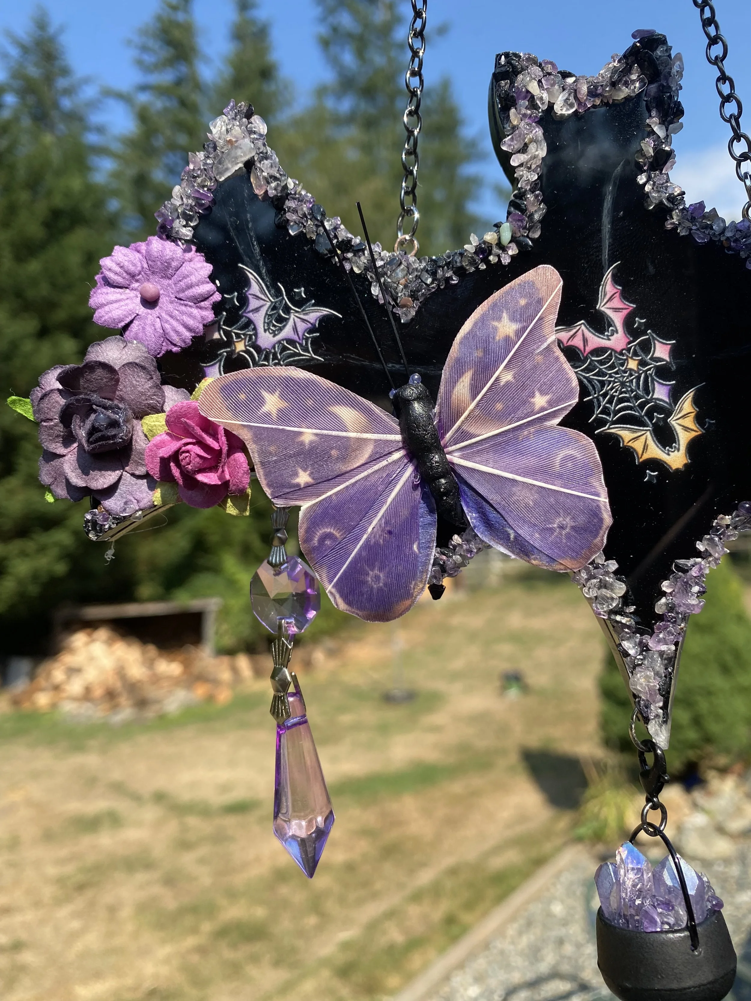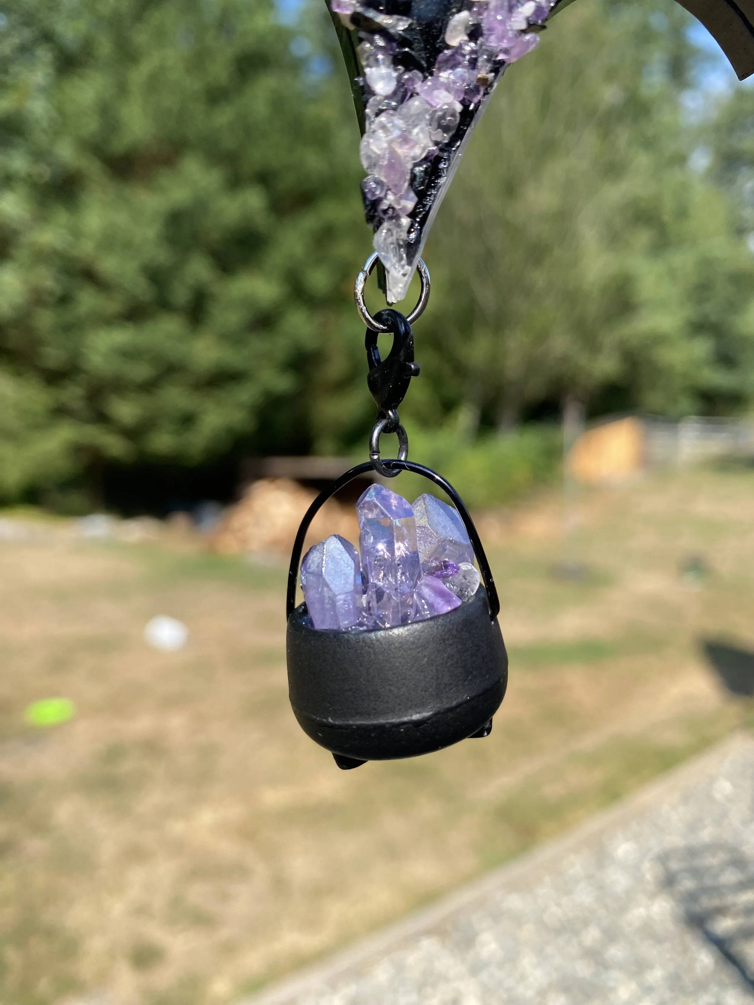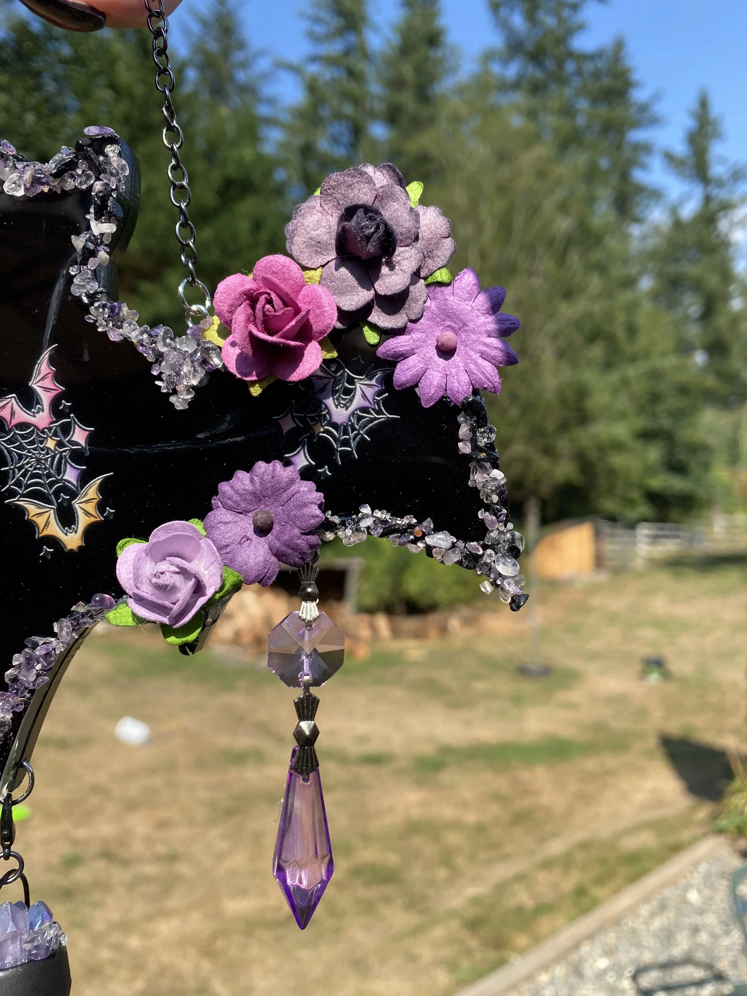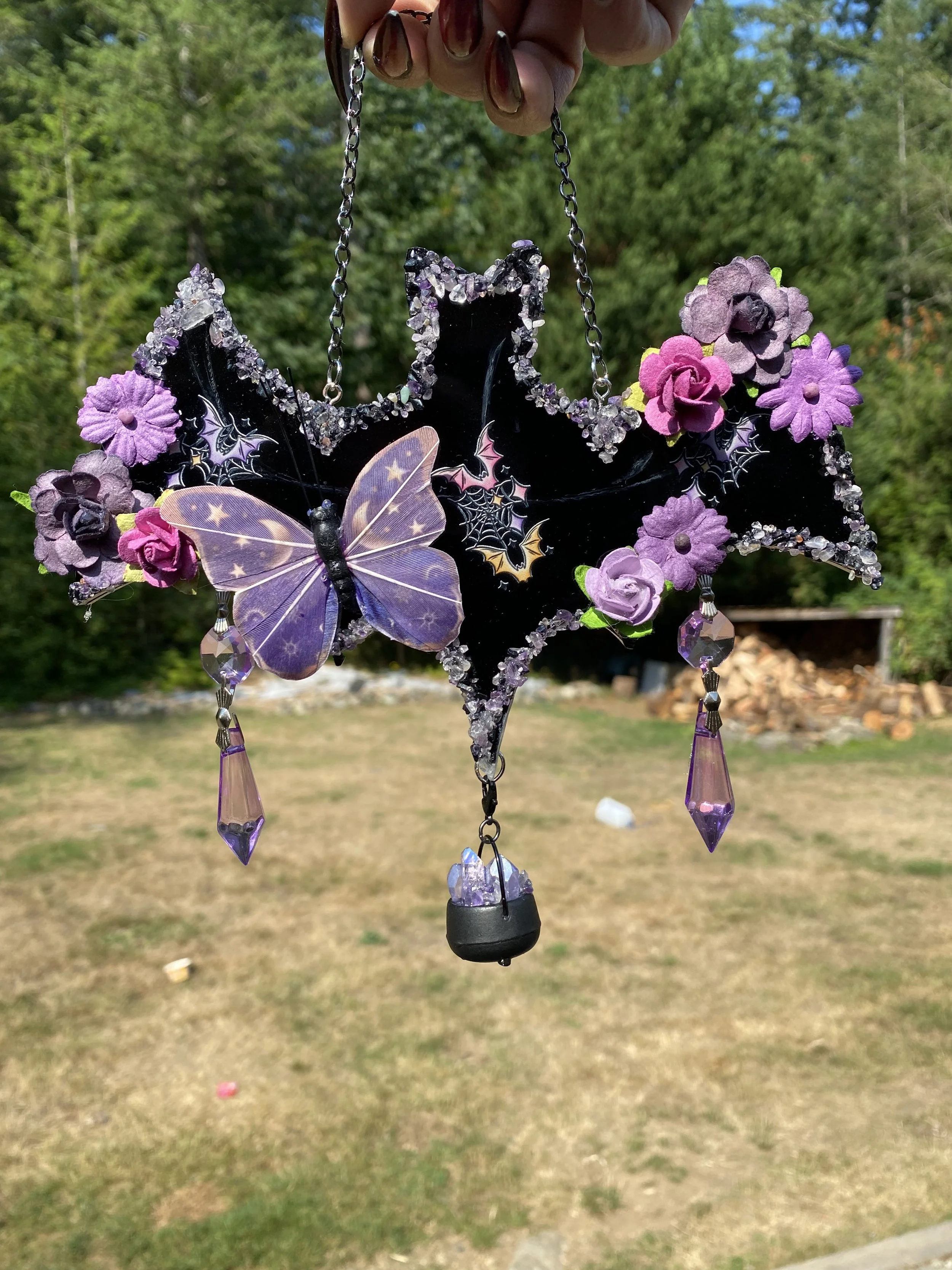 Shop › Hanging Floral Bat w/ Cauldron Image 1 of 4 Image 2 of 4 Image 3 of 4 Image 4 of 4 Hanging Floral Bat w/ Cauldron $85.00 Sold Out With a cast iron cauldron, purple aura quartz and chips of obsidian, rose quartz and amethyst Sold Out Added! With a cast iron cauldron, purple aura quartz and chips of obsidian, rose quartz and amethyst