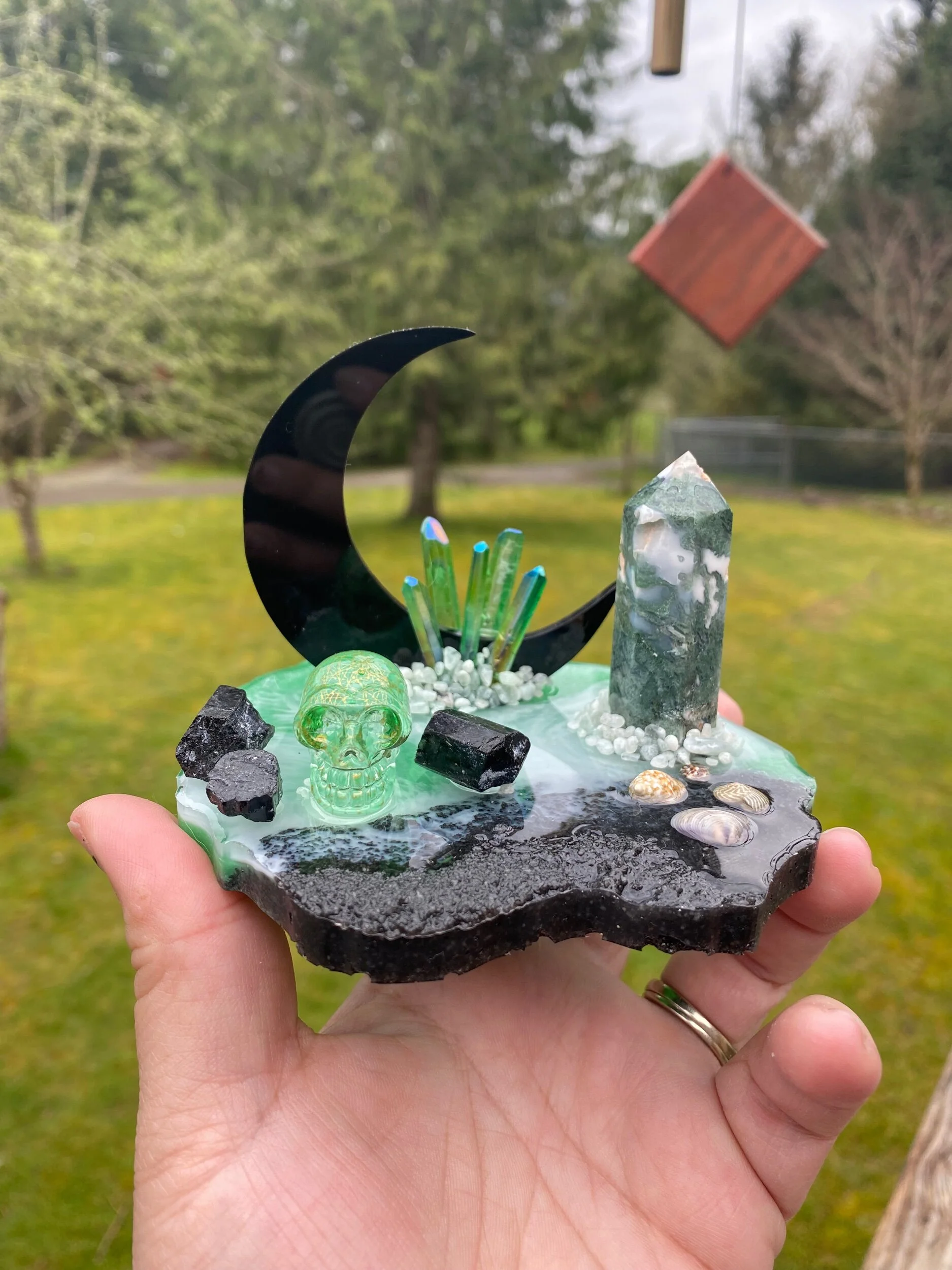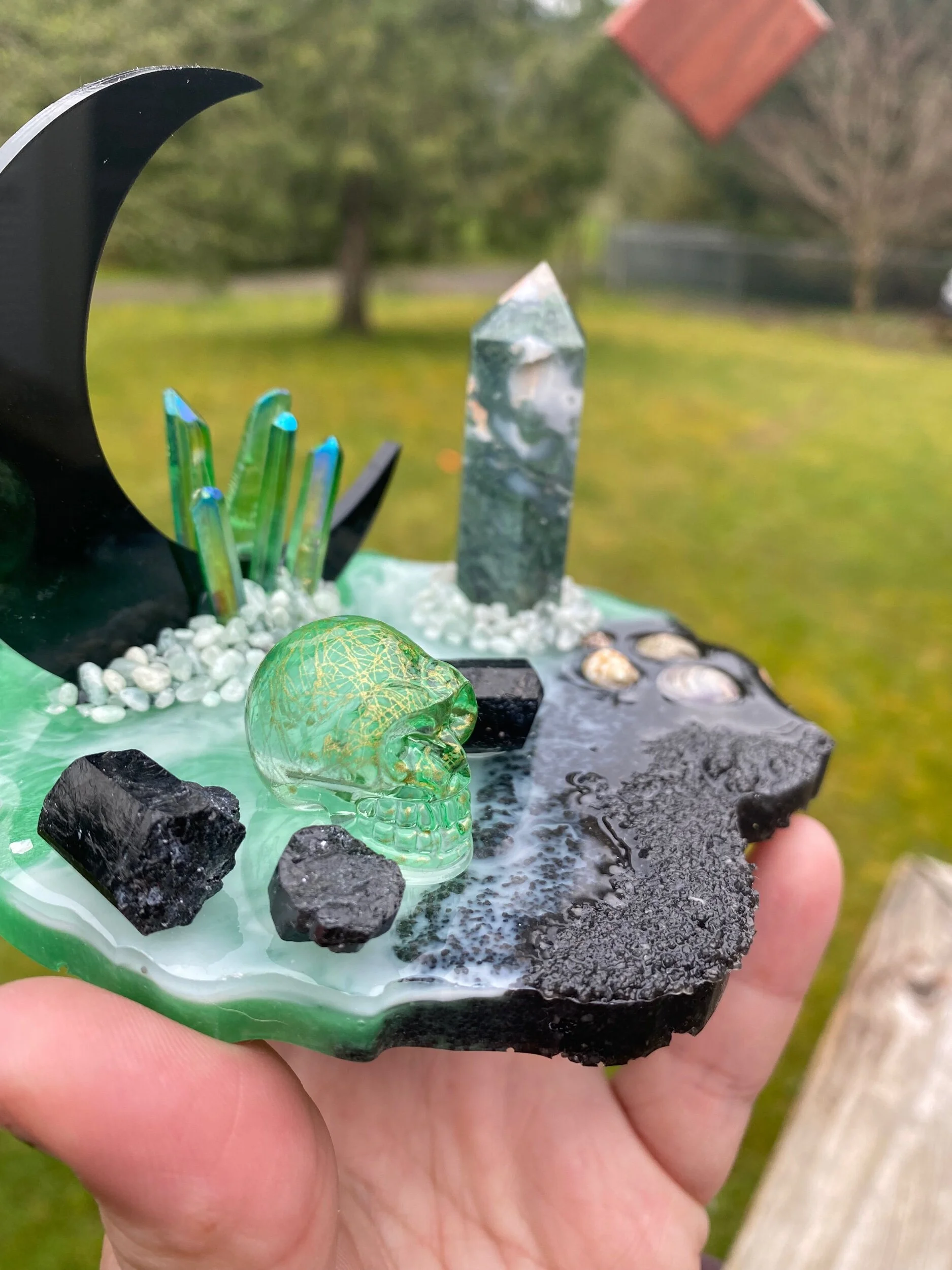 With aura Quartz skull, green aura points, black tourmaline and chips of green moonstone with sea shells and black sand
