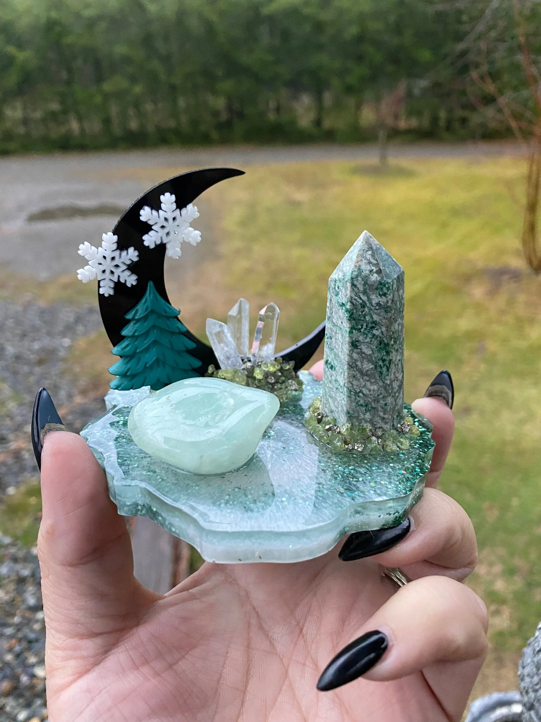With a green kyanite tower, prehnite tumble, Quartz points and chips of peridot and pyrite