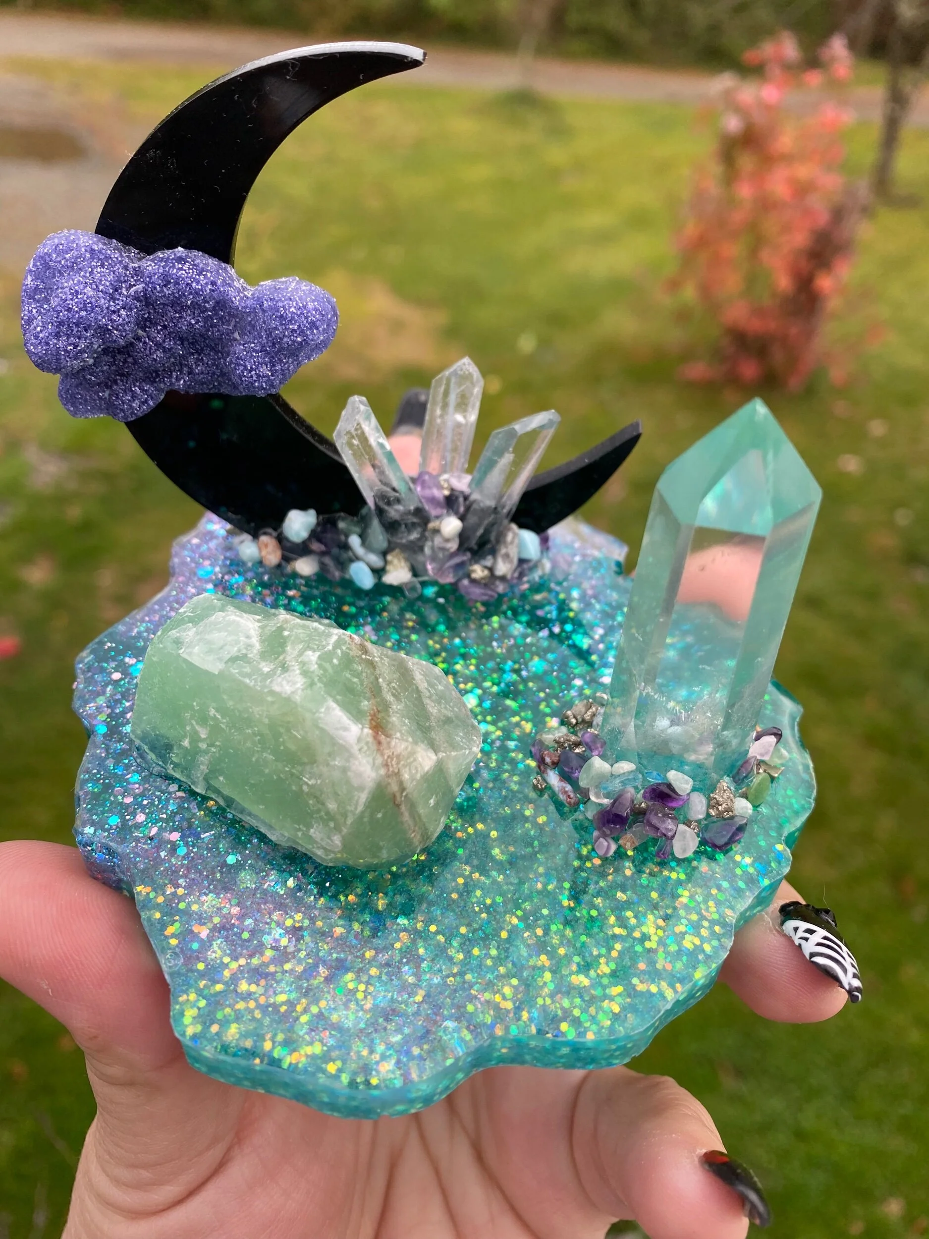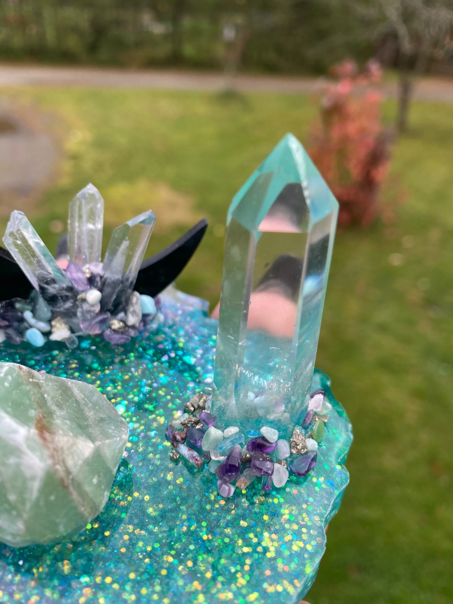 With raw green fluorite and chips of pyrite, aquamarine and amethyst