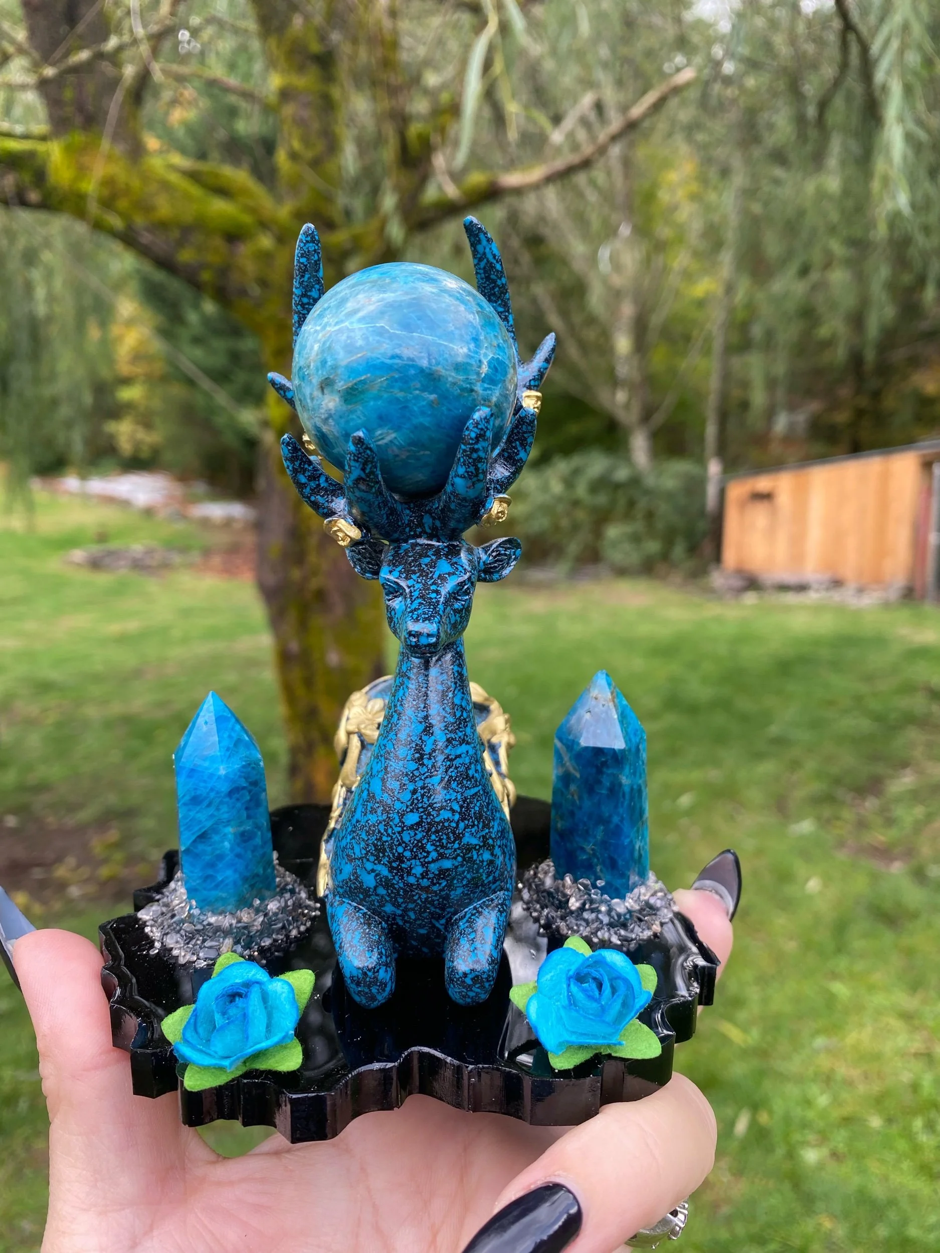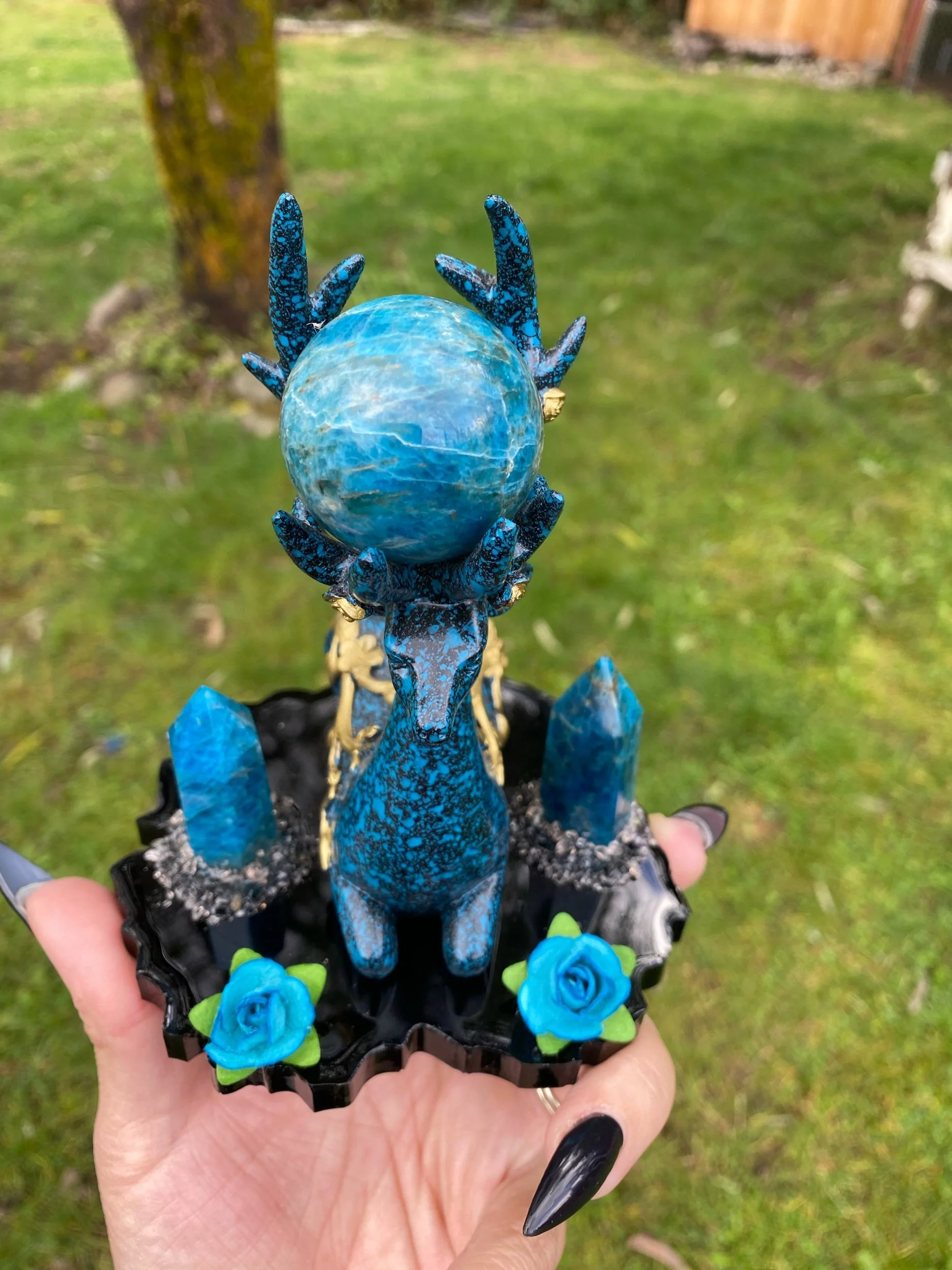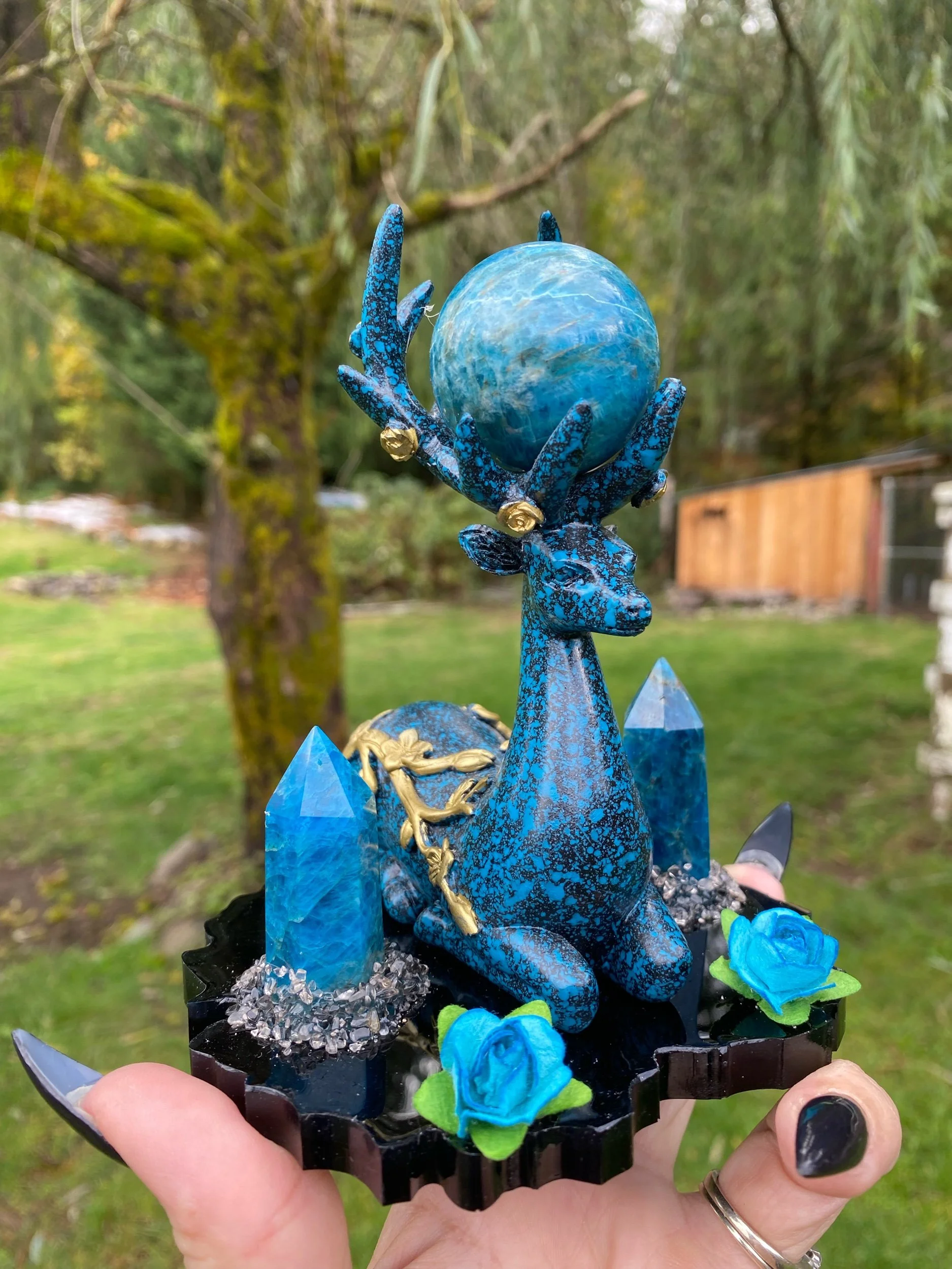 Shop › Deer with Blue Apatite Image 1 of 4 Image 2 of 4 Image 3 of 4 Image 4 of 4 Deer with Blue Apatite $75.00 Sold Out With a blue apatite sphere and 2 blue apatite towers. With smoky quartz chips. Sold Out Added! With a blue apatite sphere and 2 blue apatite towers. With smoky quartz chips.