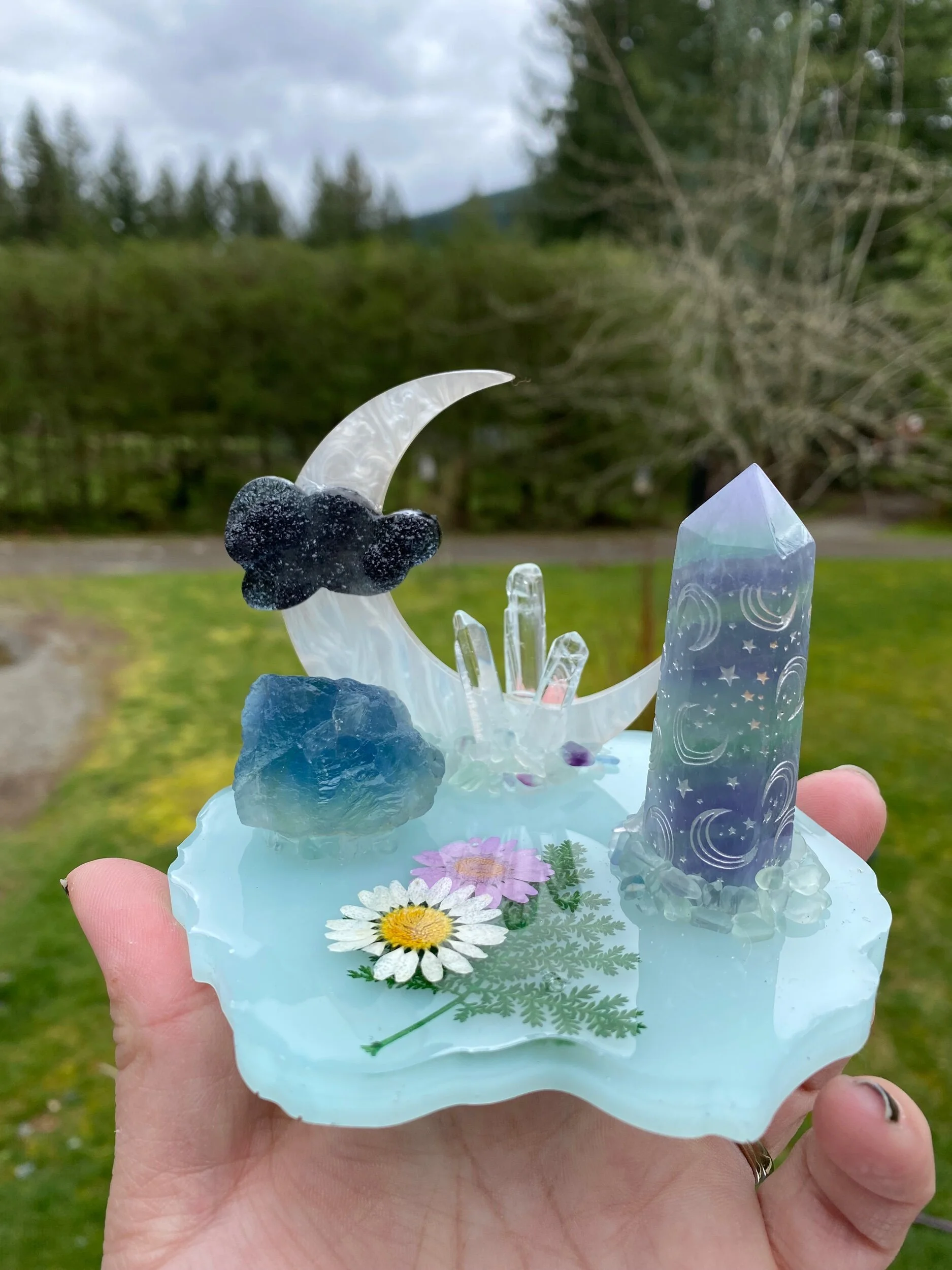 With beautiful raw blue fluorite, chips of Rainbow fluorite and real pressed flowers