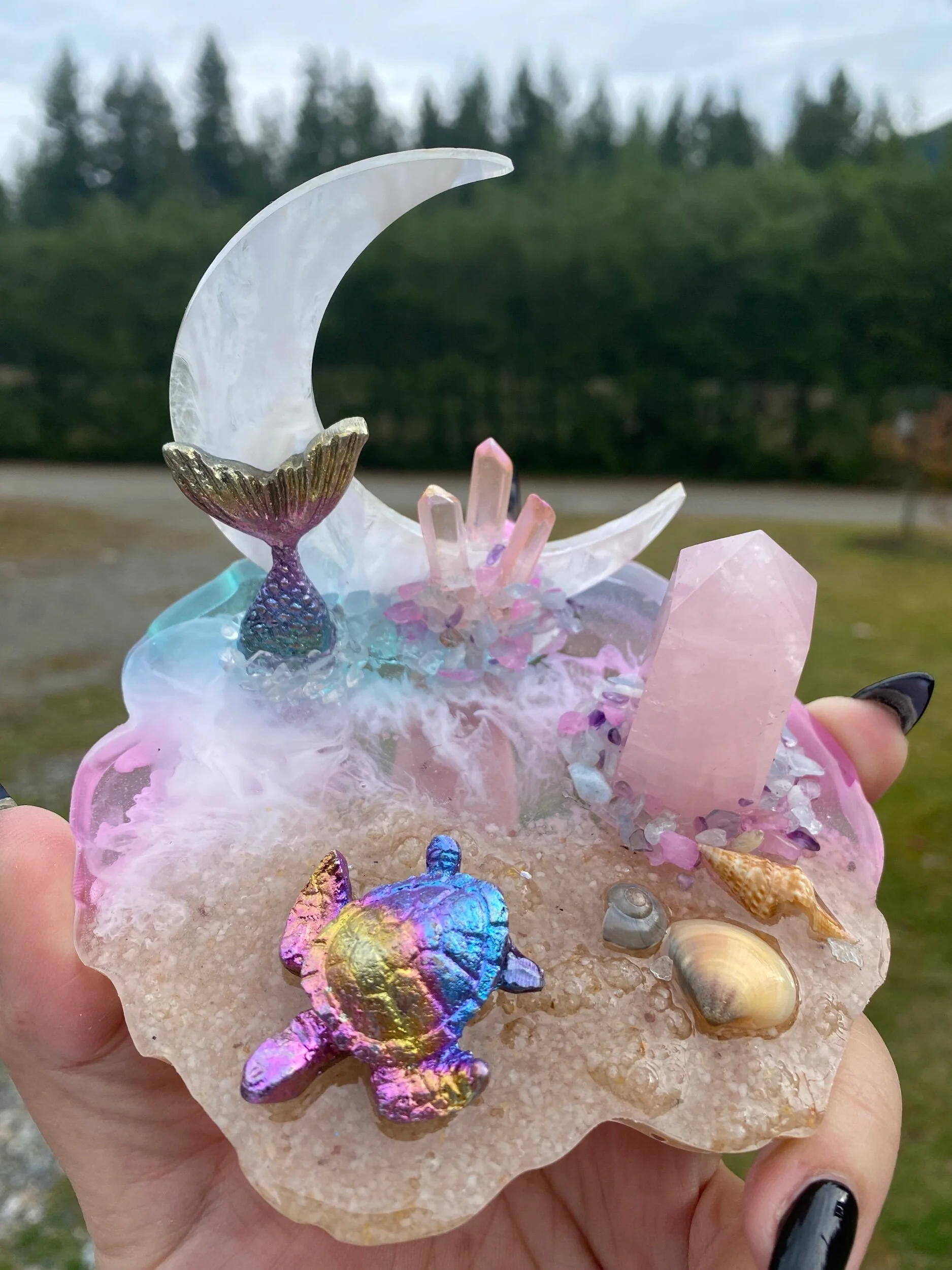 With turtle and mermaid tail bismuth carvings, a rose quartz tower, Quartz points and rose quartz/aquamarine chips.