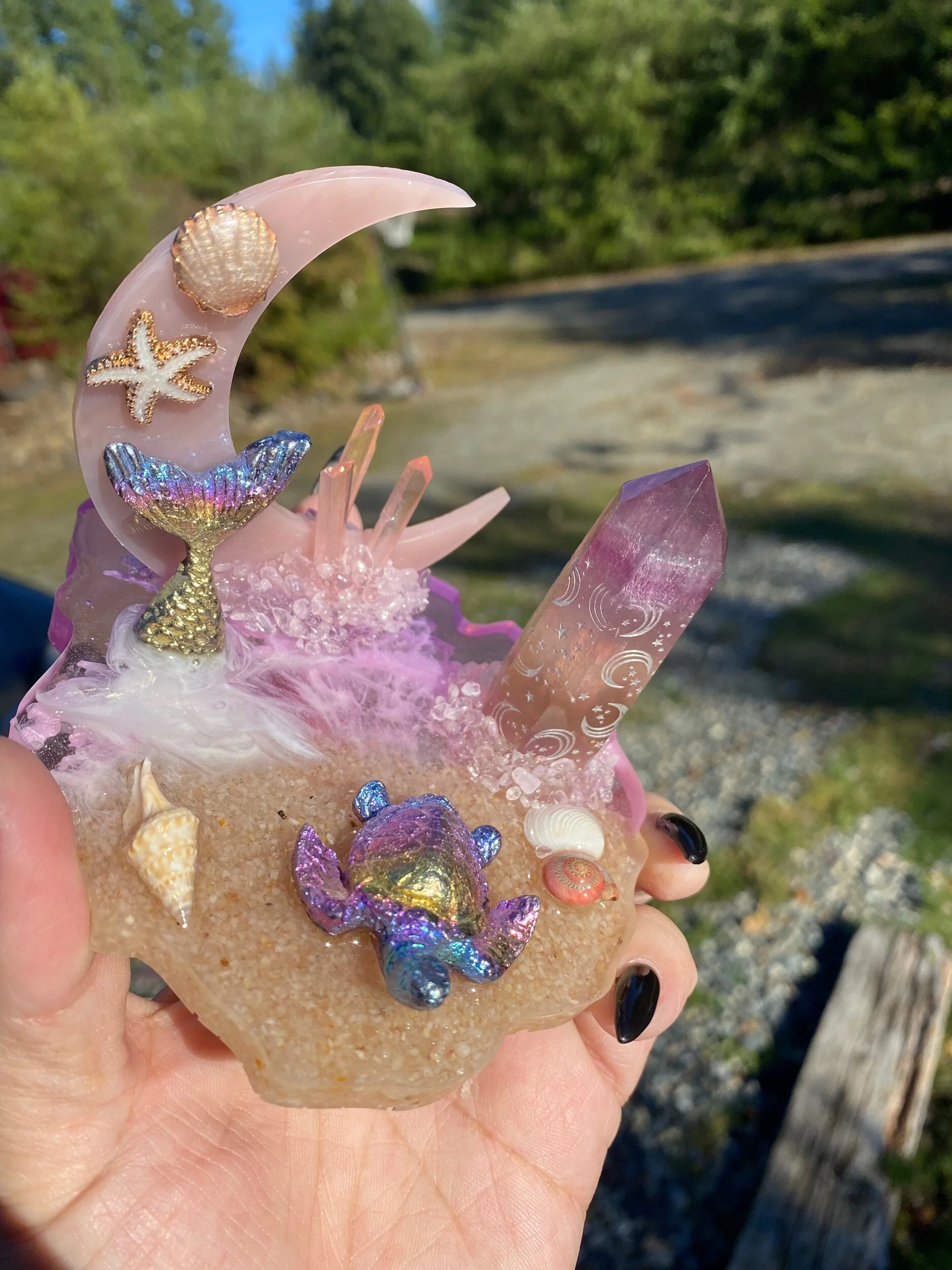 With turtle and mermaid tail bismuth carvings, fluorite tower with moon and star engraving, aura Quartz points and rose quartz chips