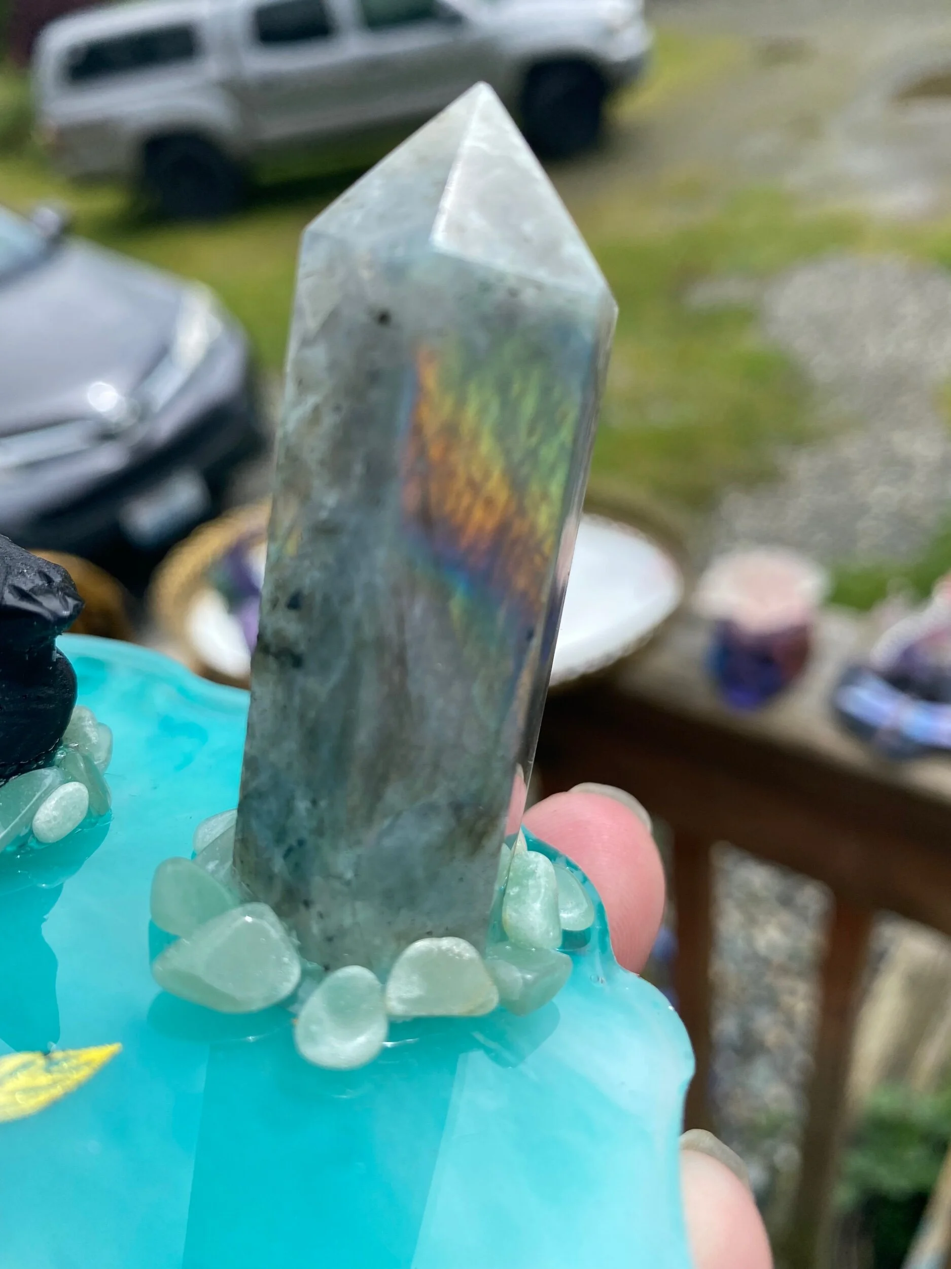 With chips of amazonite and blue aura quartz