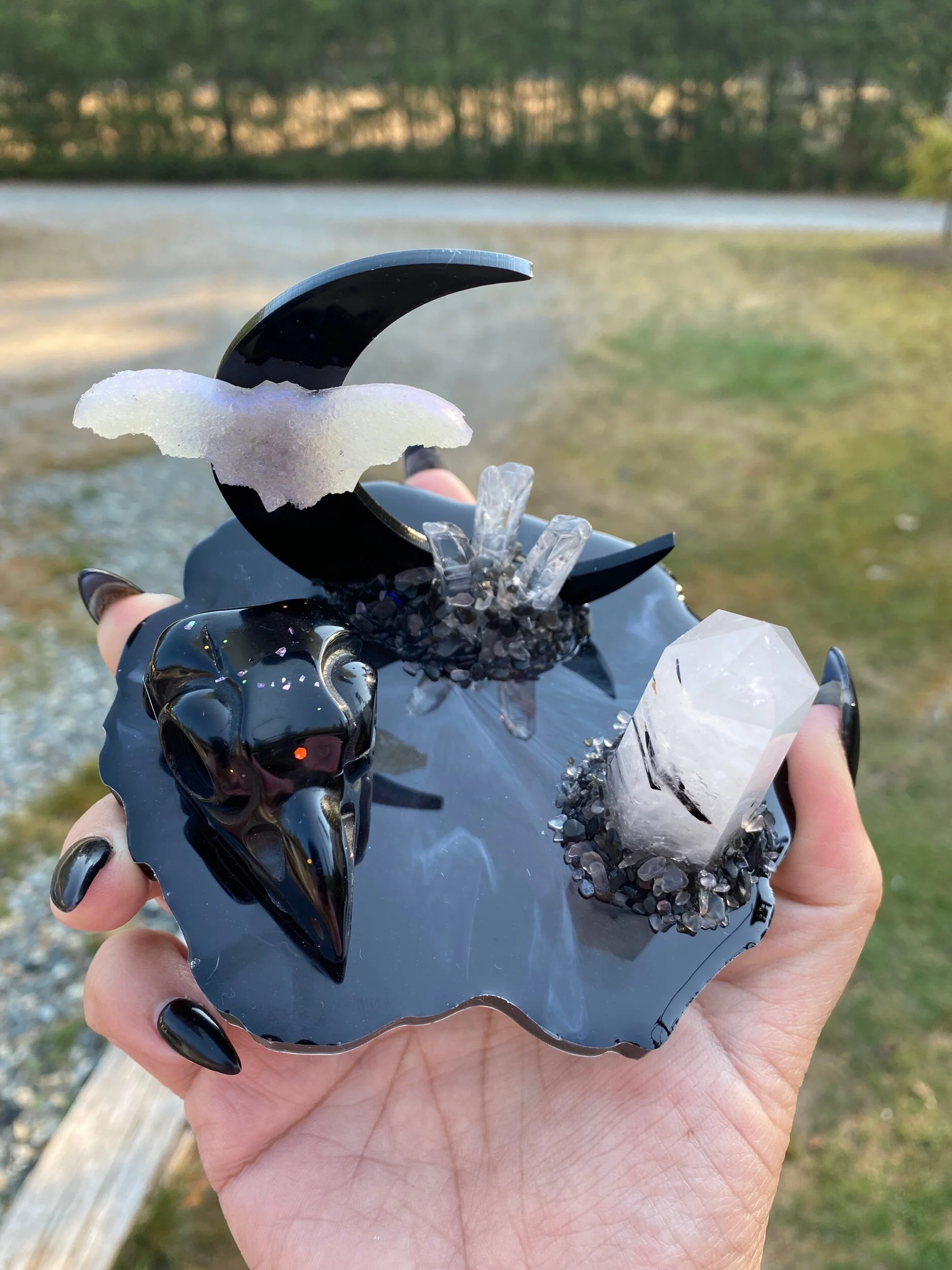 With a raven skull, Quartz points and chips of black tourmaline
