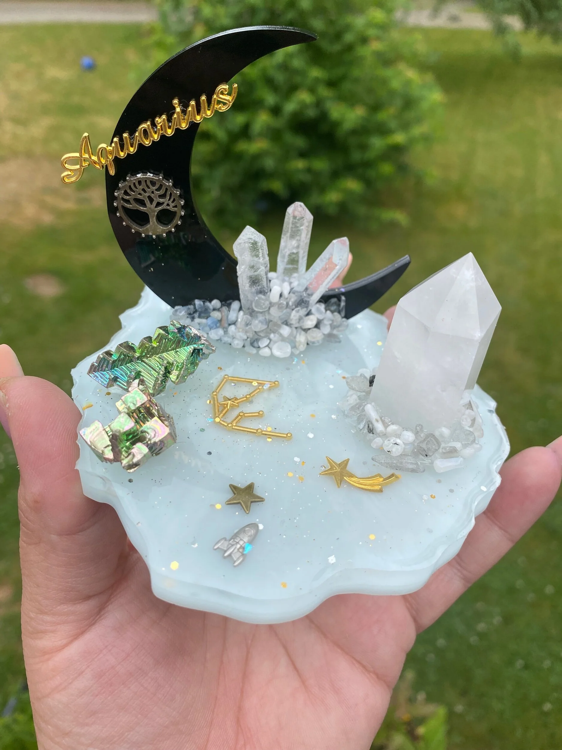 Shop › Mini Moon Zodiac- Aquarius Image 1 of 2 Image 2 of 2 Mini Moon Zodiac- Aquarius $59.00 Sold Out With milky Quartz tower, moonstone chips and bismuth Sold Out Added! With milky Quartz tower, moonstone chips and bismuth