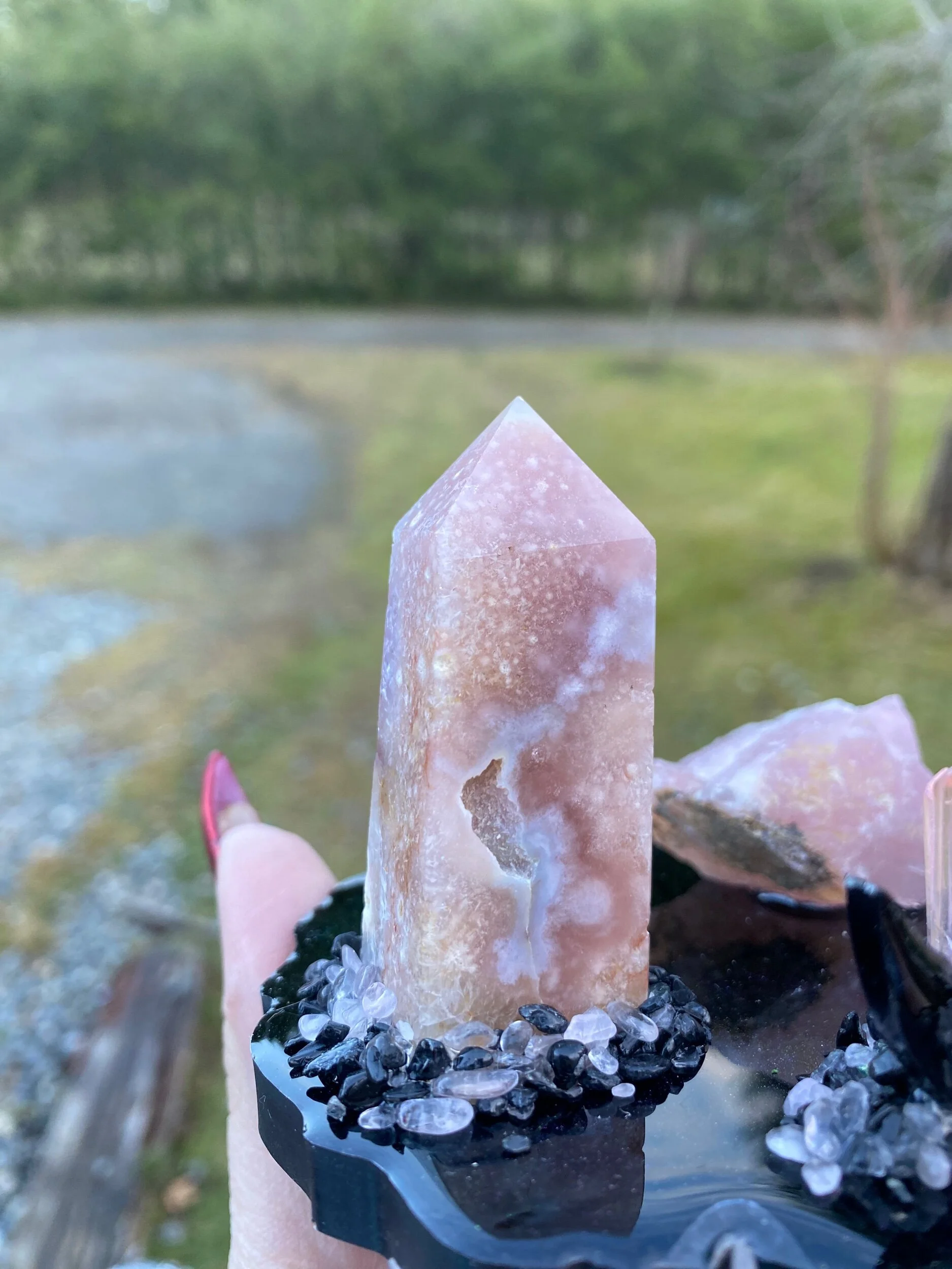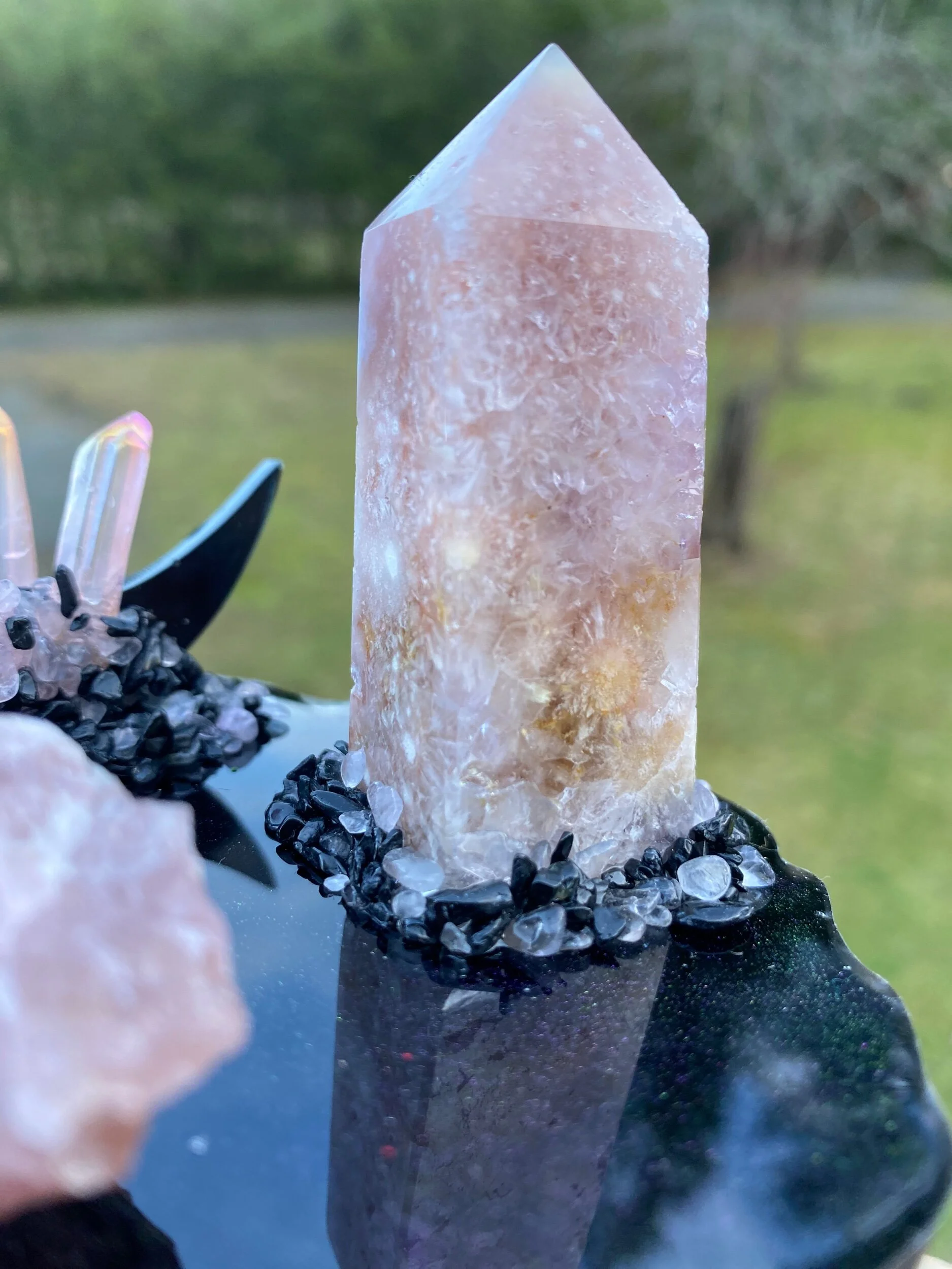 With raw Rose Quartz, pink aura points and chips of Rose Quartz and obsidian