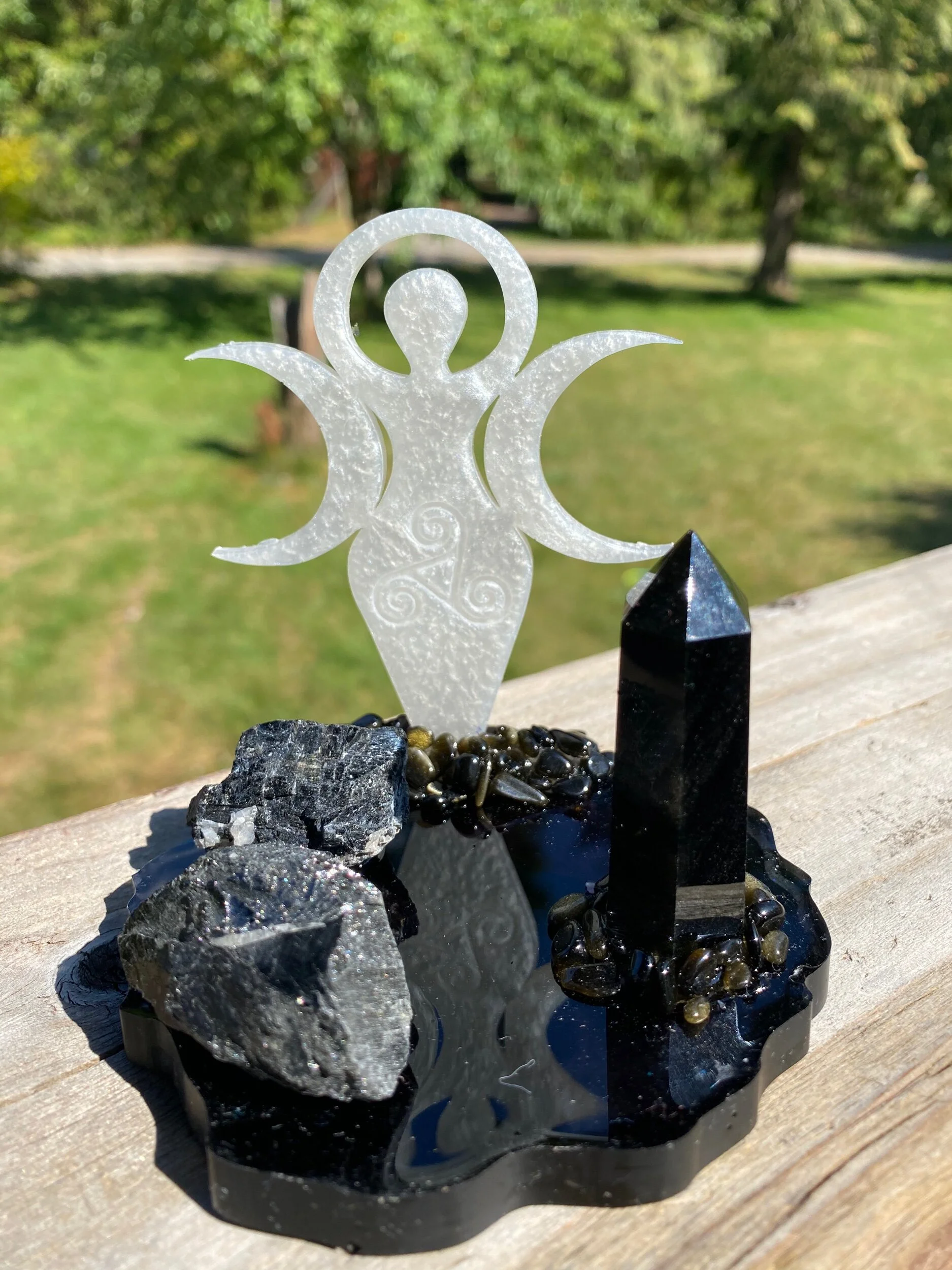 With raw black tourmaline and obsidian chips