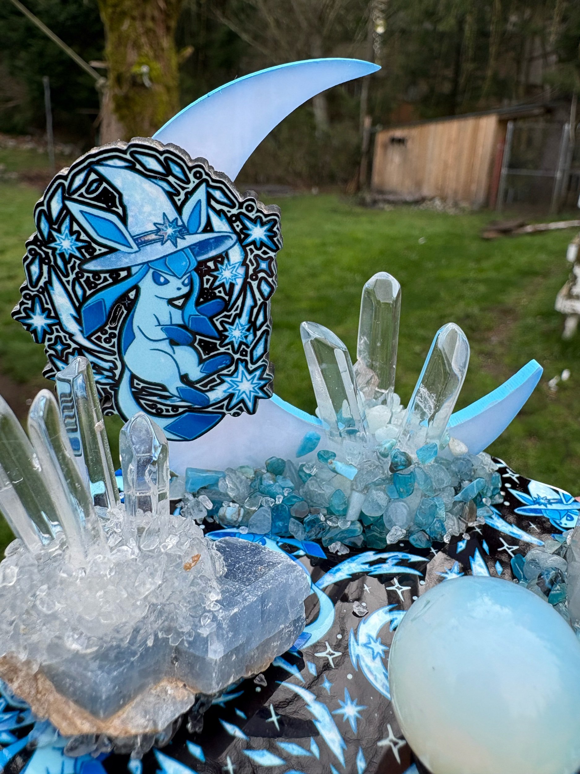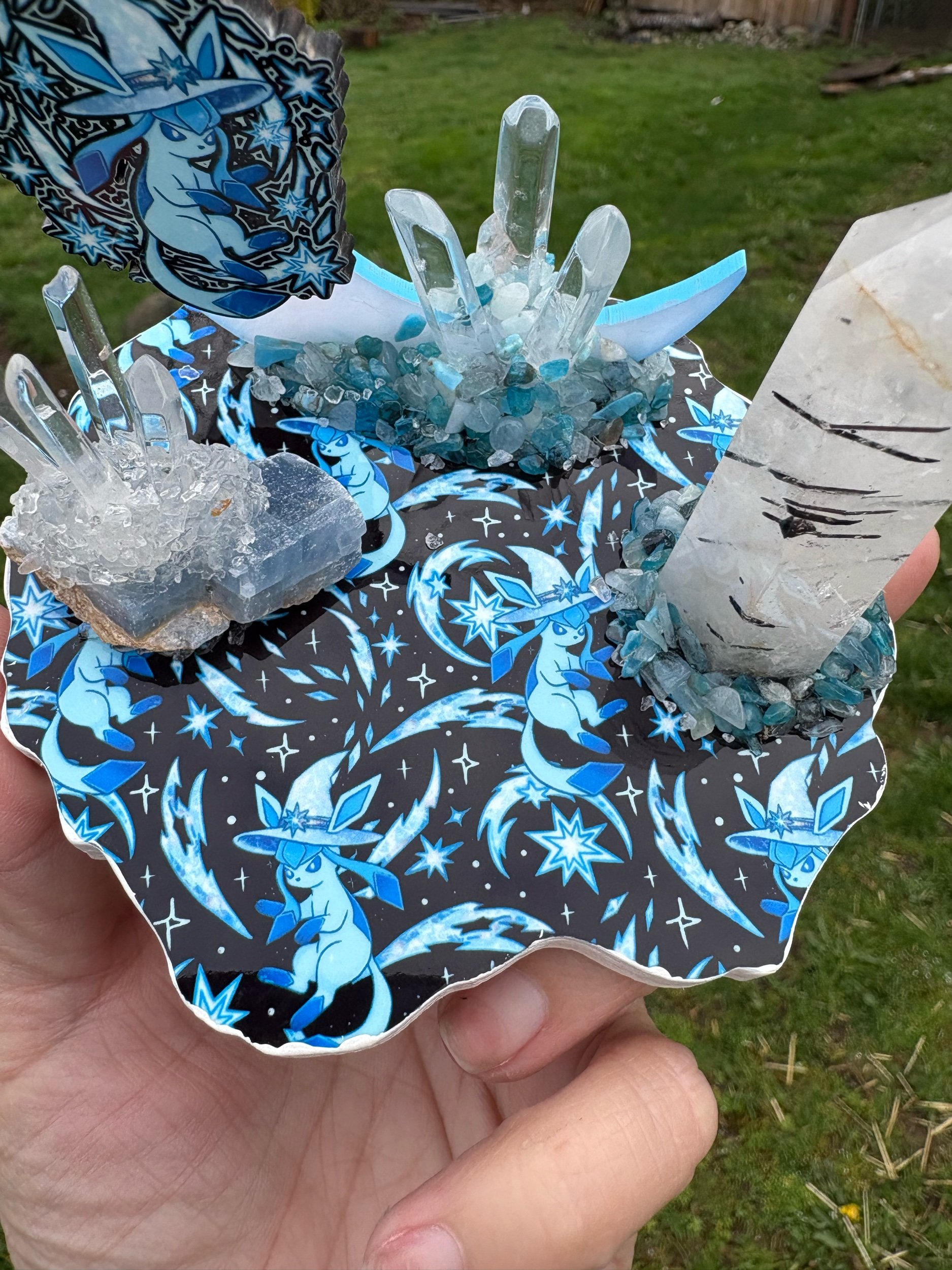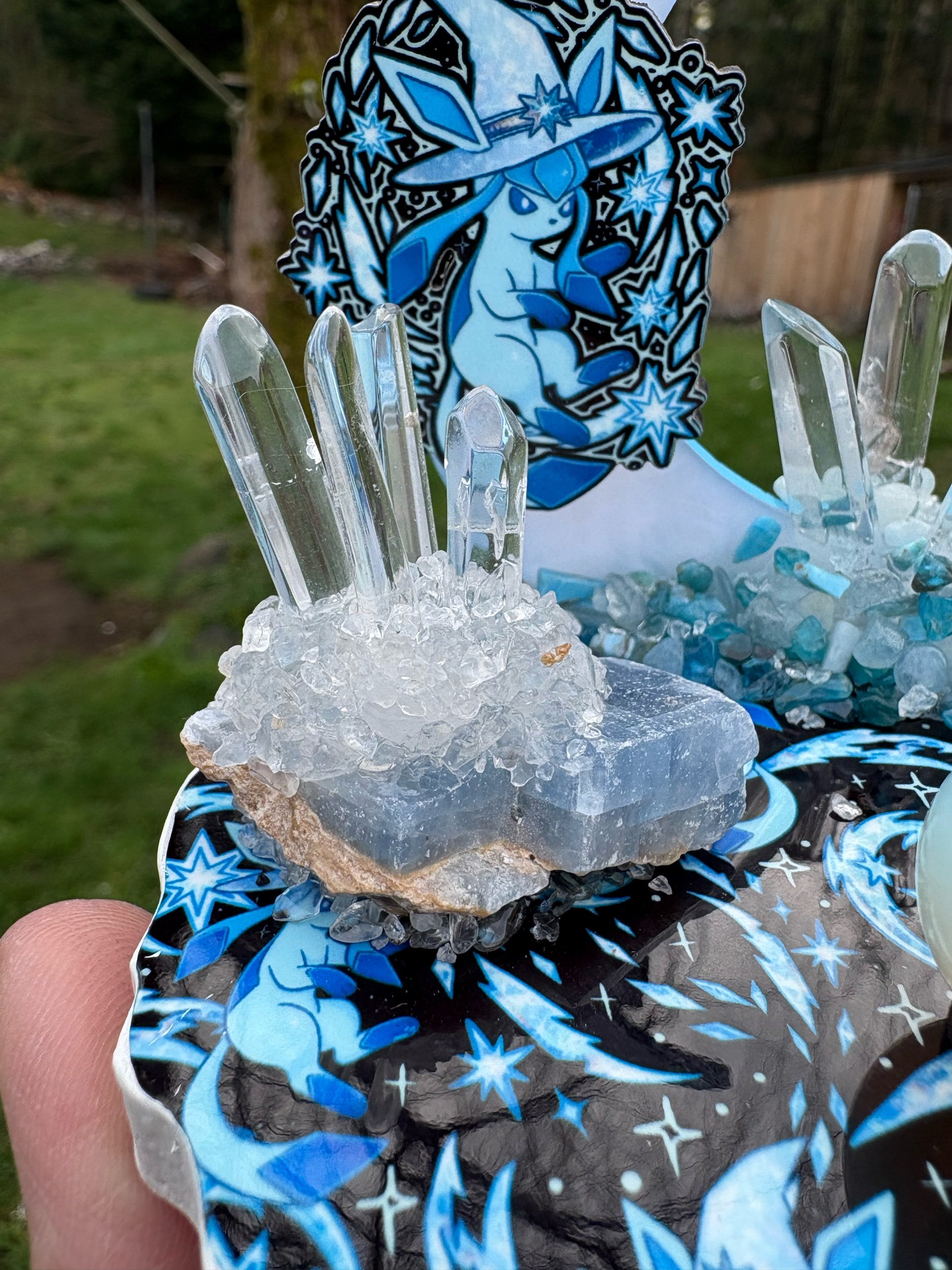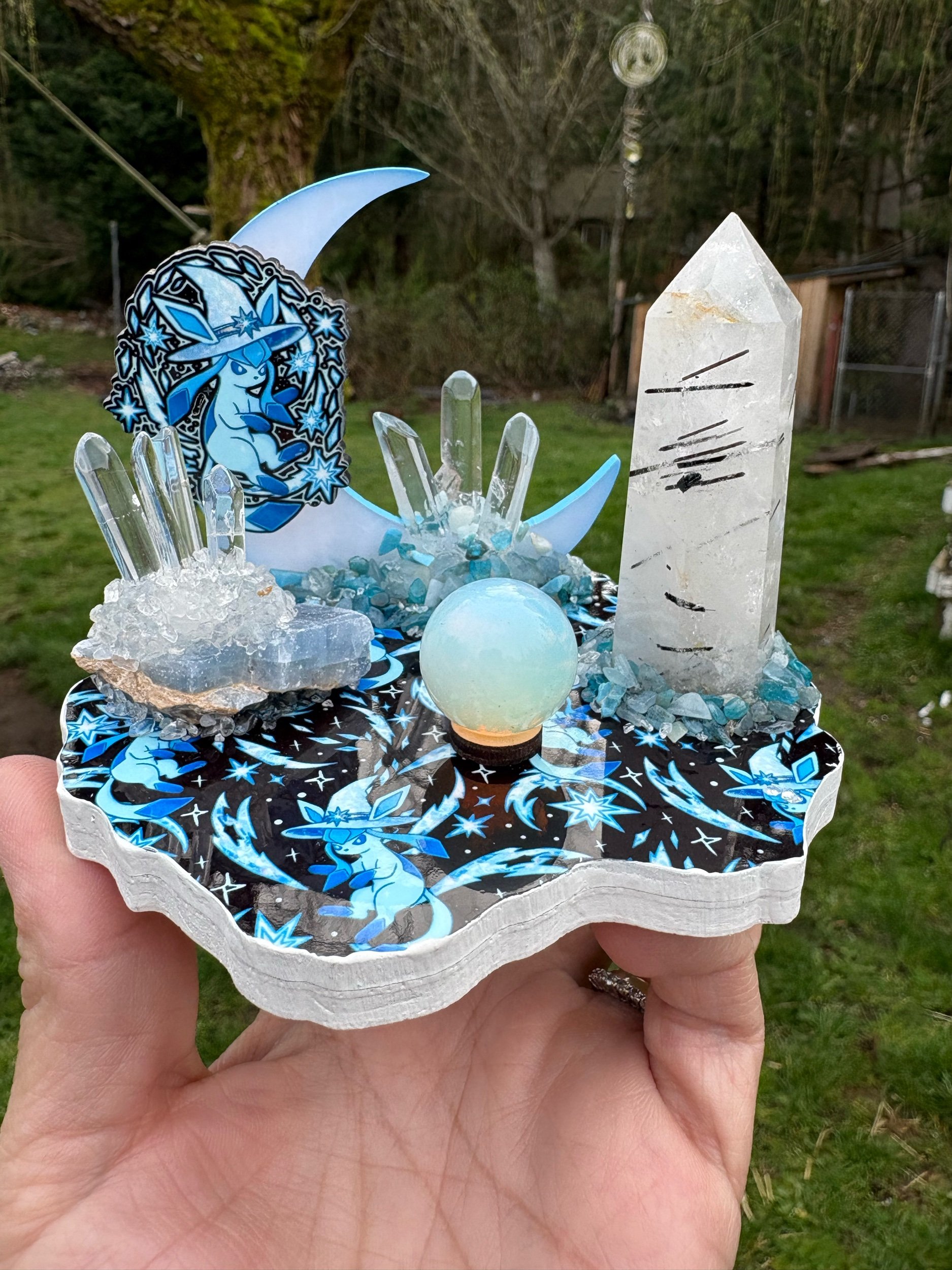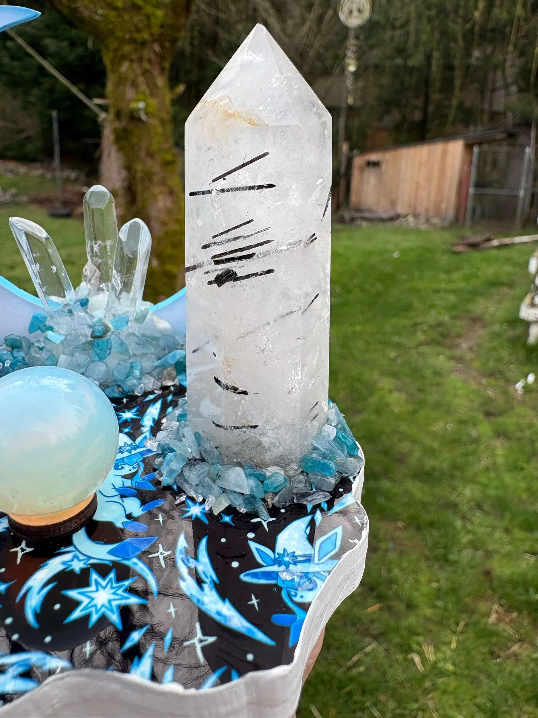 With a quartz cluster on a piece of blue calcite, opalite mini sphere, Quartz points and chips of aquamarine and blue apatite