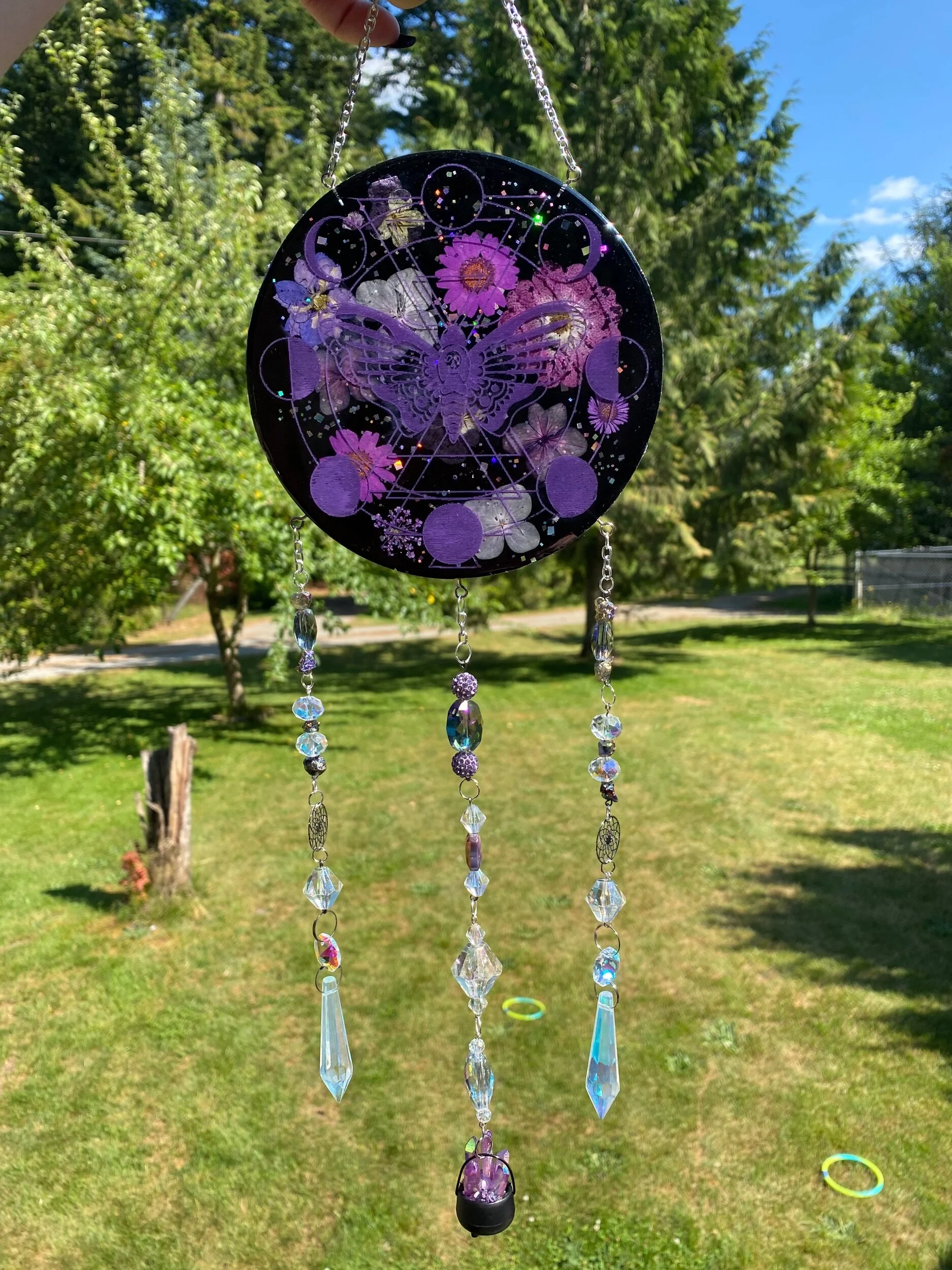 With real pressed flowers, peacock ore beads, aura points and amethyst chips inside cauldron