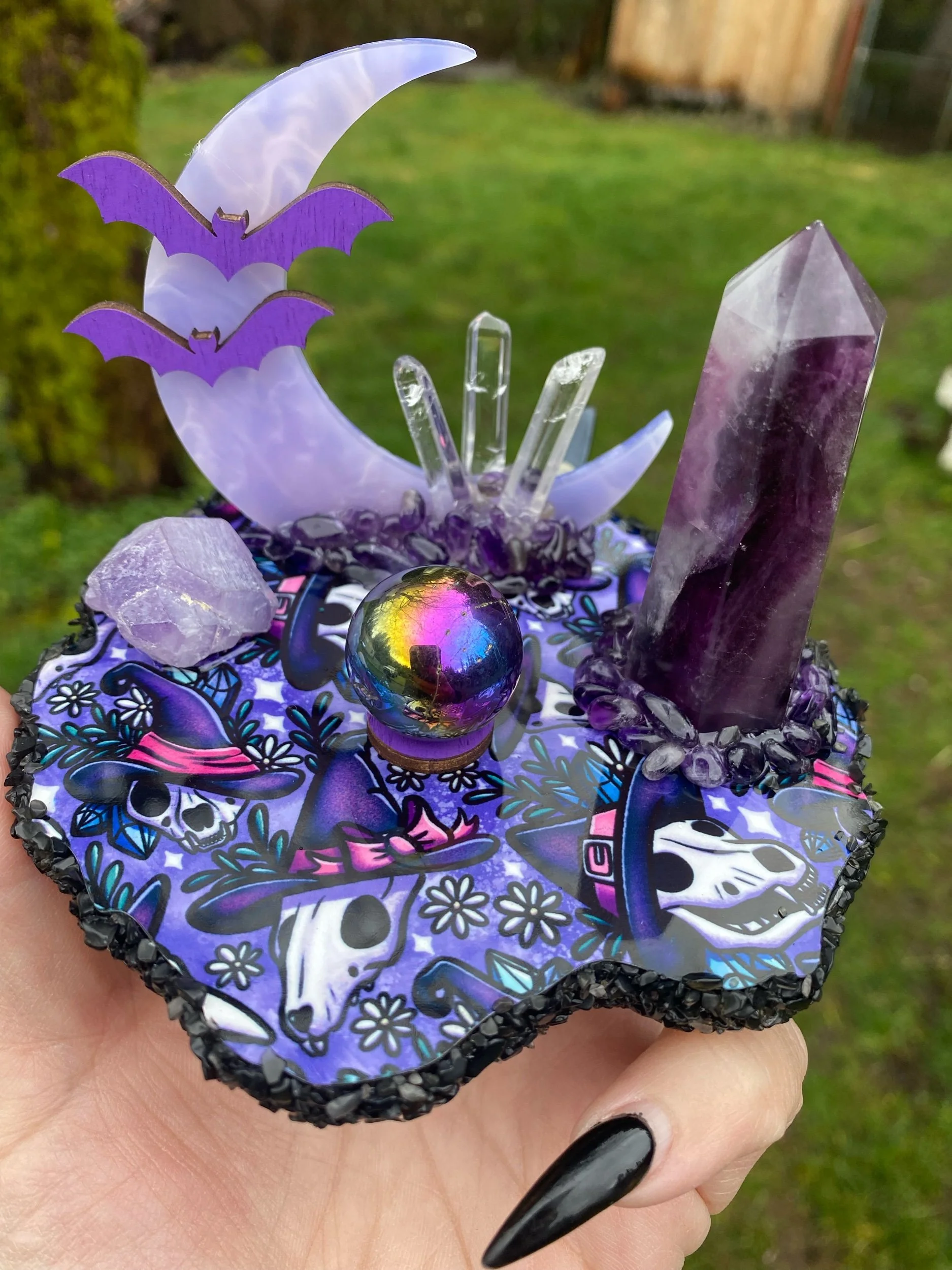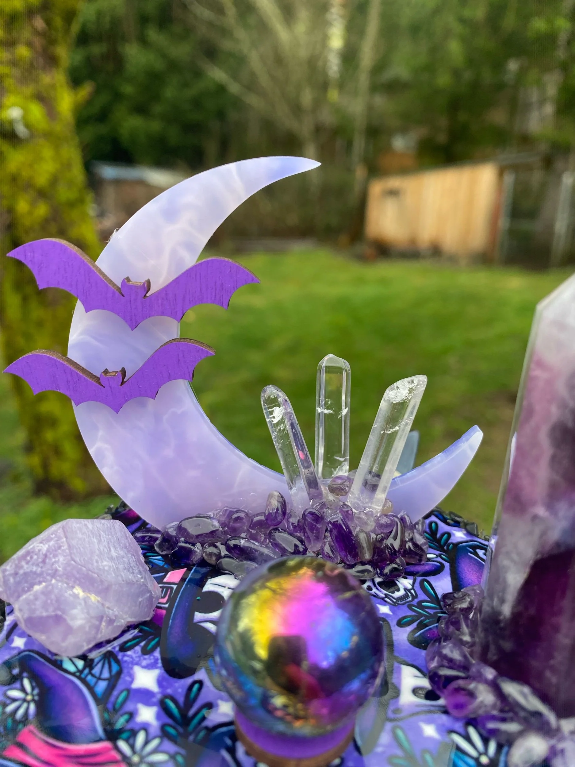 Shop › Mini Moon with Amethyst Tower Image 1 of 4 Image 2 of 4 Image 3 of 4 Image 4 of 4 Mini Moon with Amethyst Tower $69.00 Sold Out With raw amethyst, aura obsidian mini sphere, Quartz points and chips of obsidian and amethyst. Sold Out Added! With raw amethyst, aura obsidian mini sphere, Quartz points and chips of obsidian and amethyst.