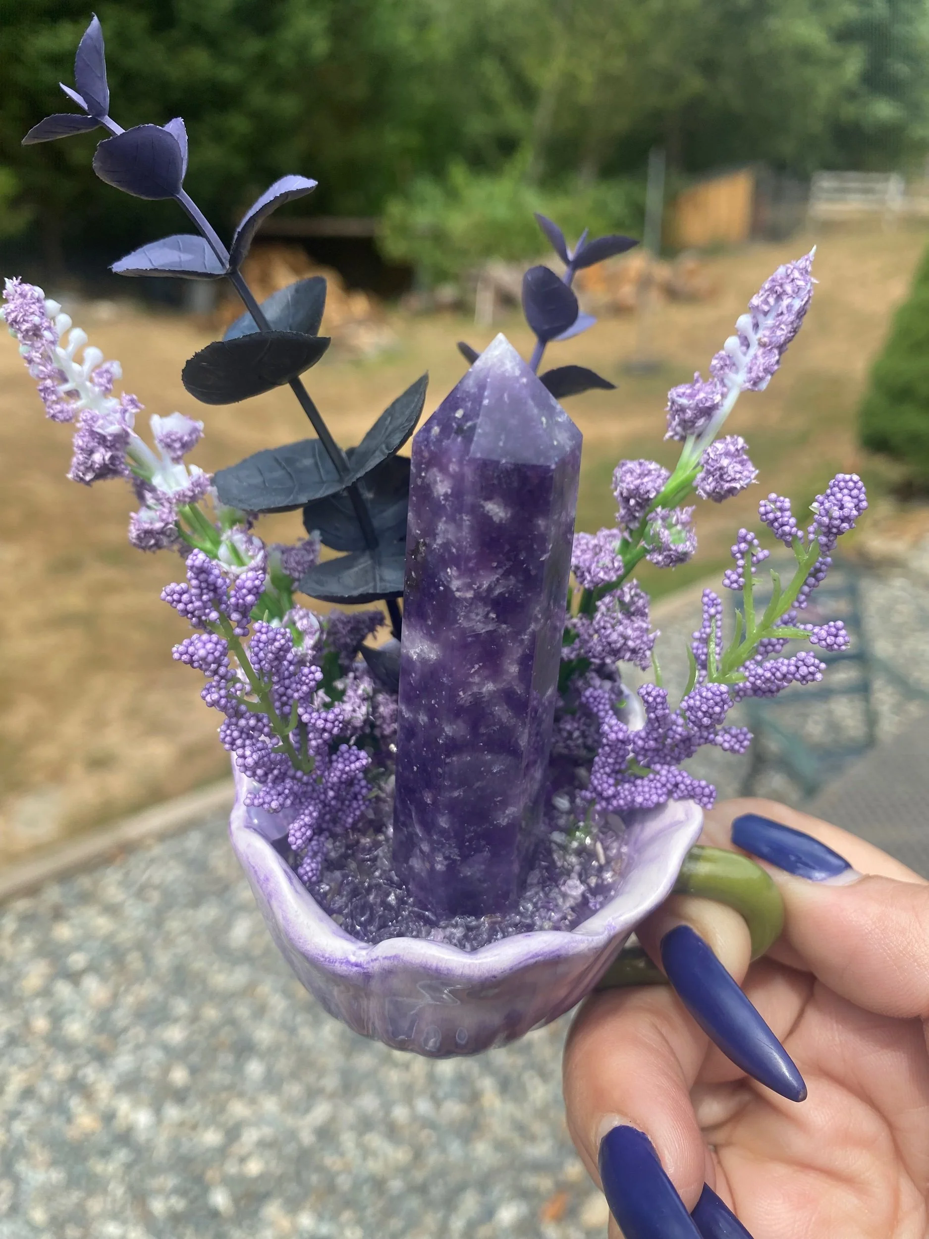 Shop › Flower Teacup with Lepidolite Tower Image 1 of 2 Image 2 of 2 Flower Teacup with Lepidolite Tower $45.00 Sold Out With amethyst chips Sold Out Added! With amethyst chips