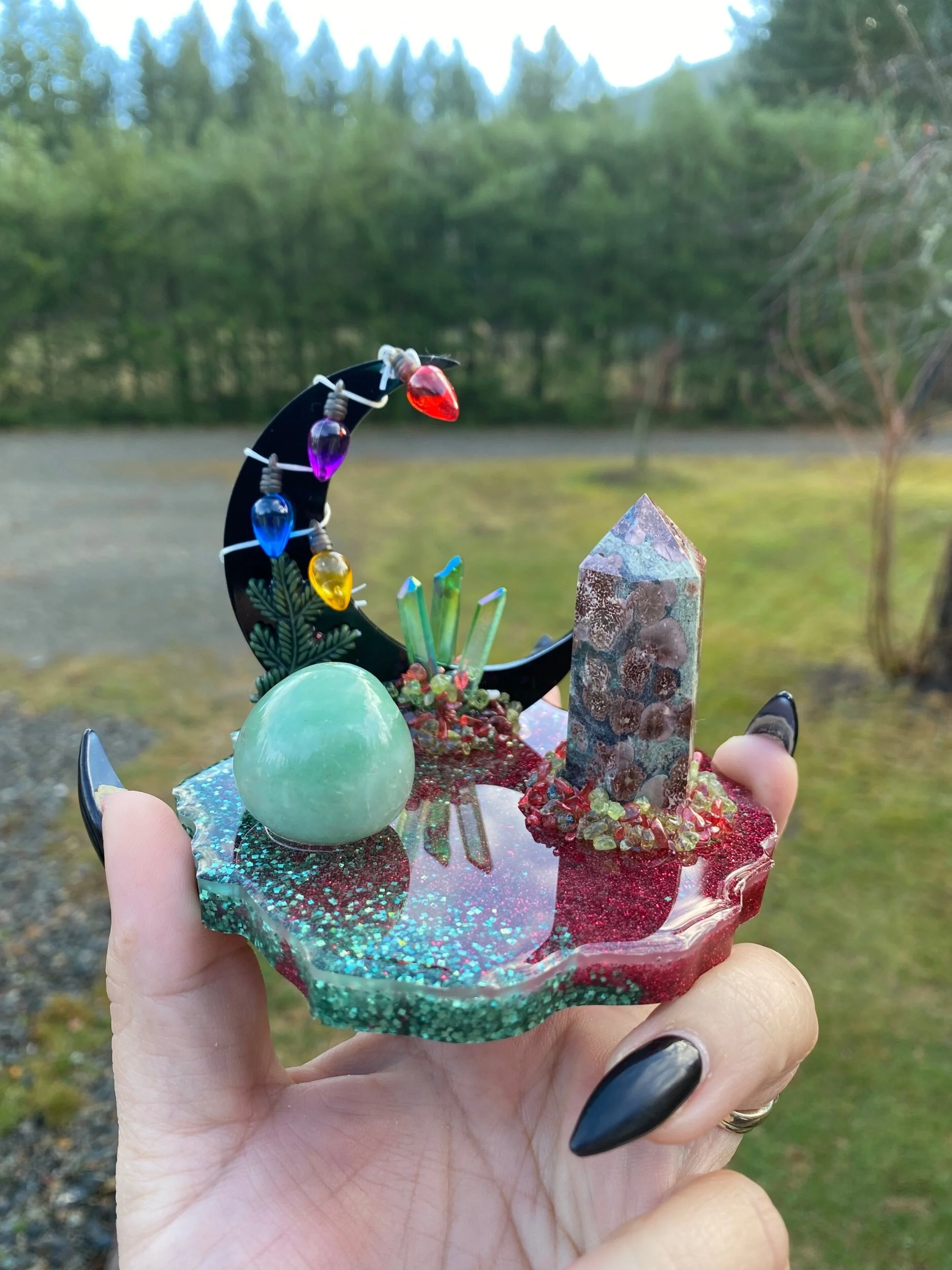 With a rhyolite tower, green aventurine tumble, aura quartz points and chips of peridot and dyed red quartz