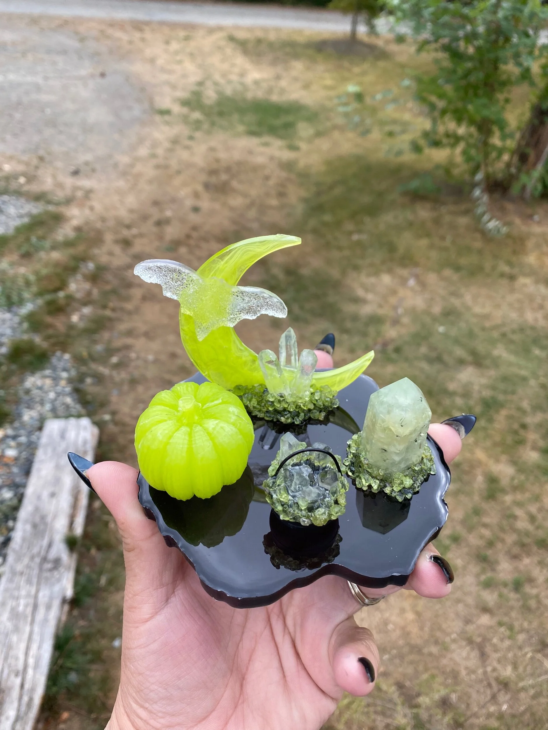 Shop › Halloween mini #6 Image 1 of 2 Image 2 of 2 Halloween mini #6 $69.00 Sold Out With a prehnite tower, peridot chips, Quartz points and crystal cauldron Sold Out Added! With a prehnite tower, peridot chips, Quartz points and crystal cauldron
