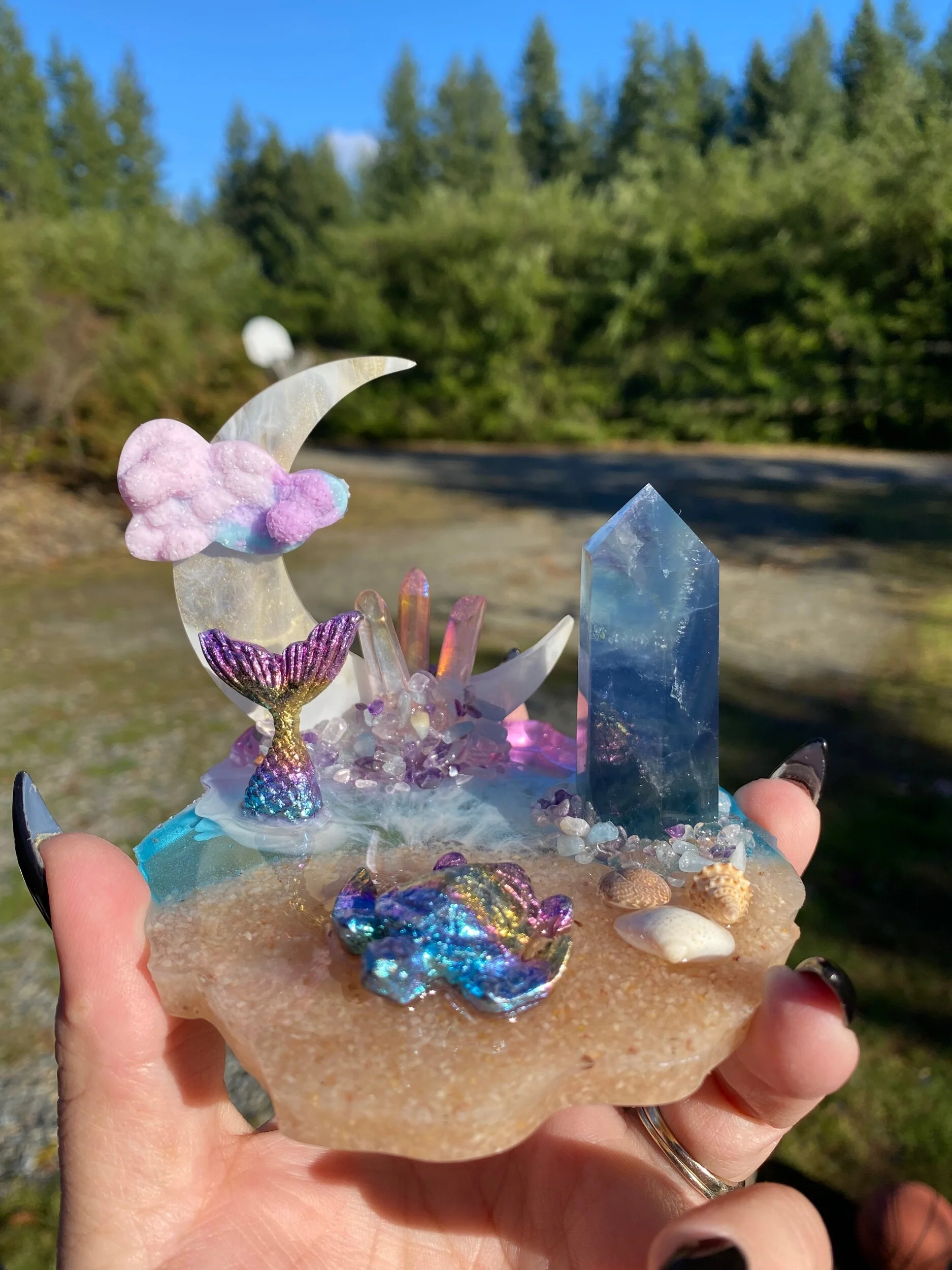 With turtle and mermaid tail bismuth carvings, a blue fluorite tower, aura Quartz points and amethyst/rose quartz/aquamarine chips.