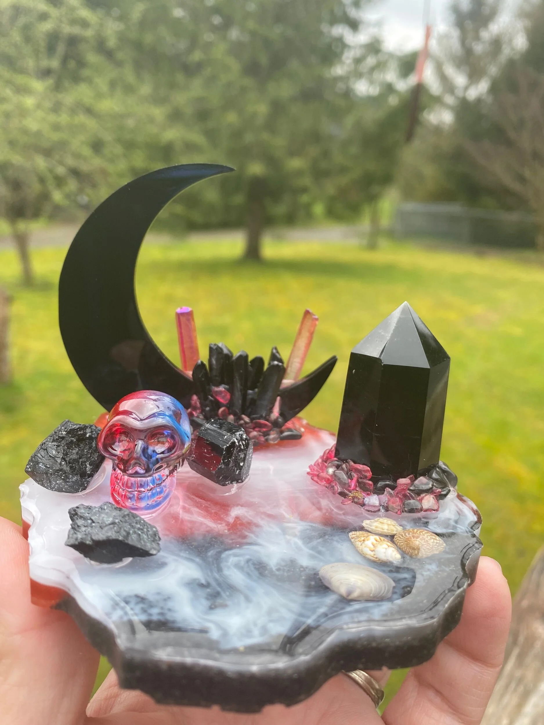 With aura Quartz skull, obsidian and red aura points, black tourmaline and chips of dyed Quartz and obsidian with sea shells and black sand