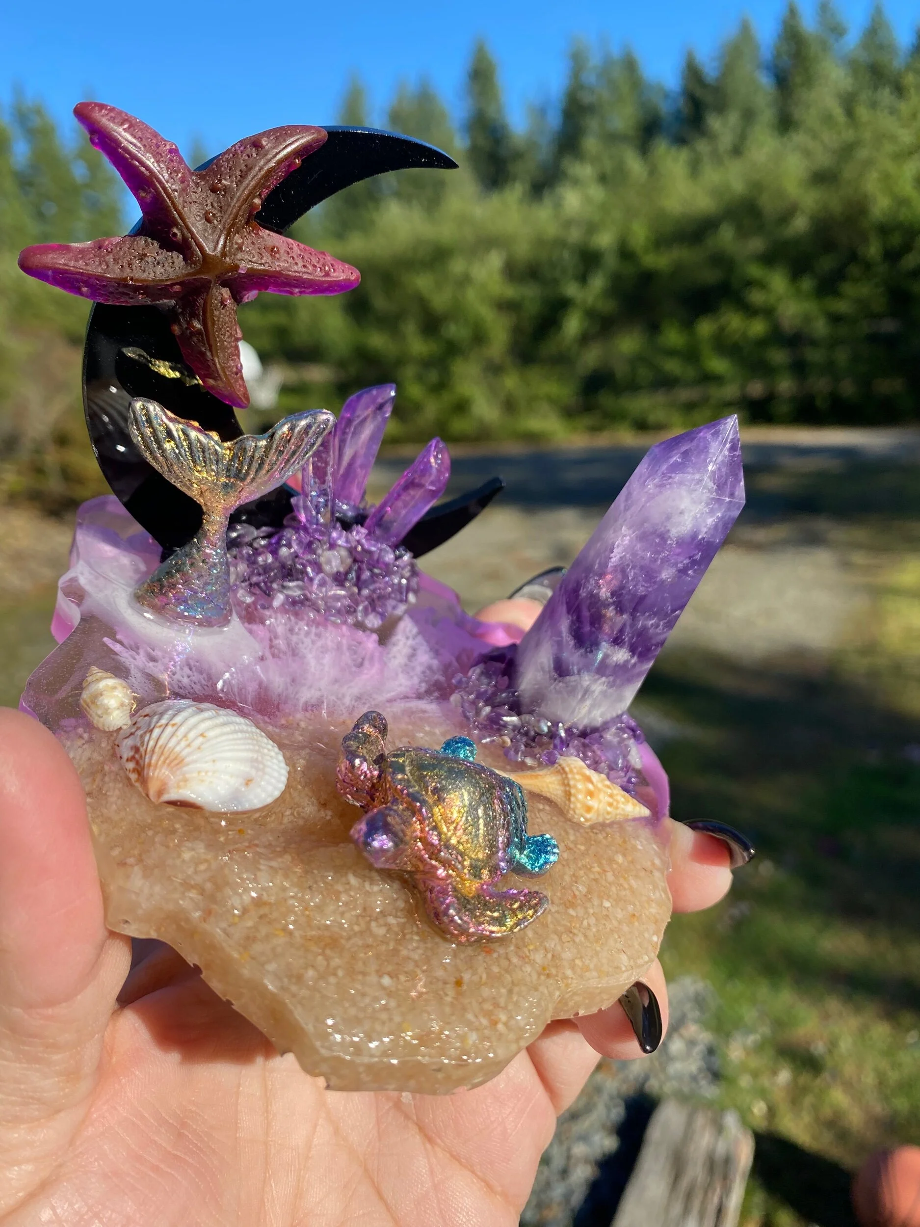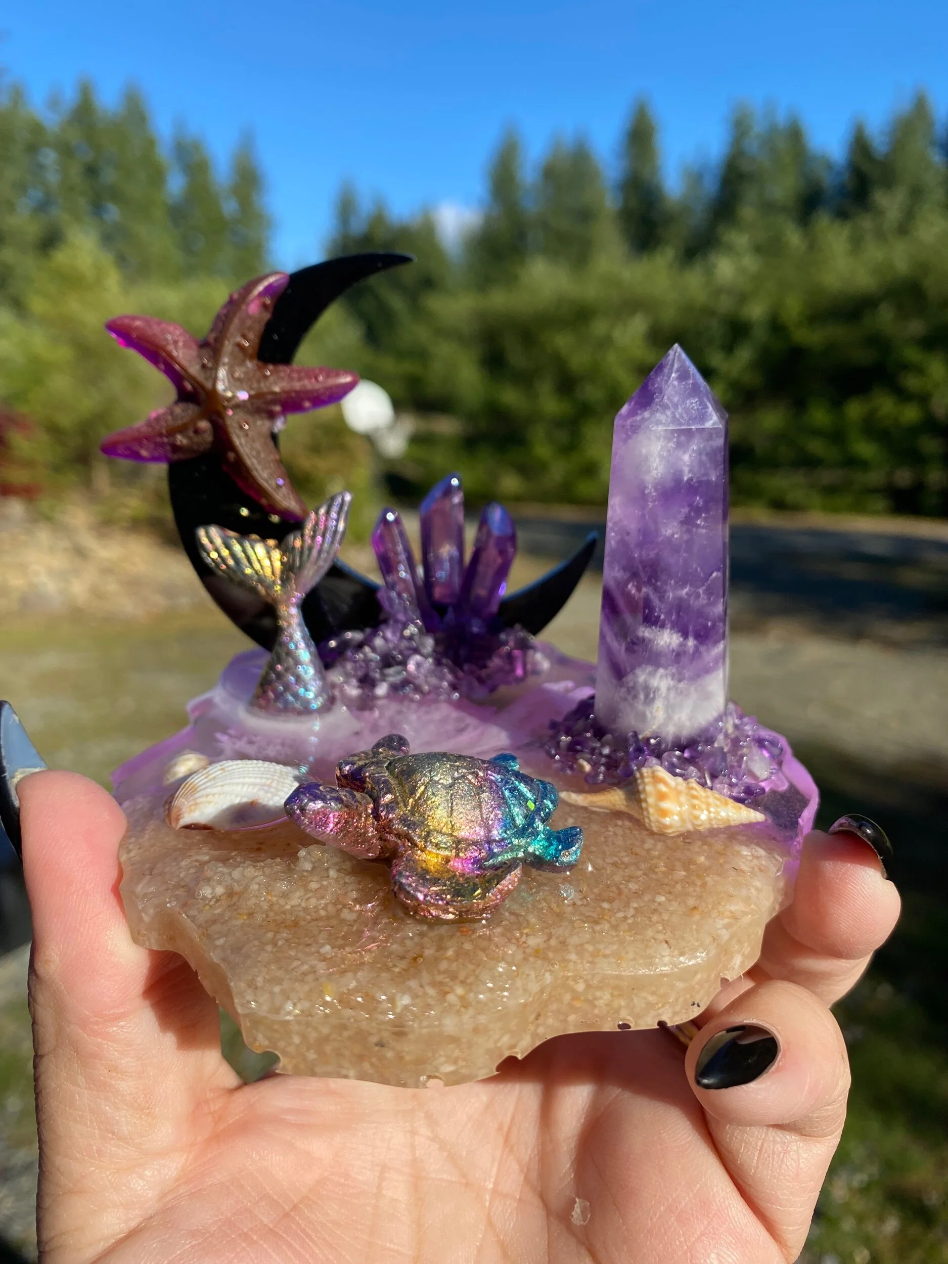 With turtle and mermaid tail bismuth carvings, an amethyst tower, aura Quartz points and amethyst chips.
