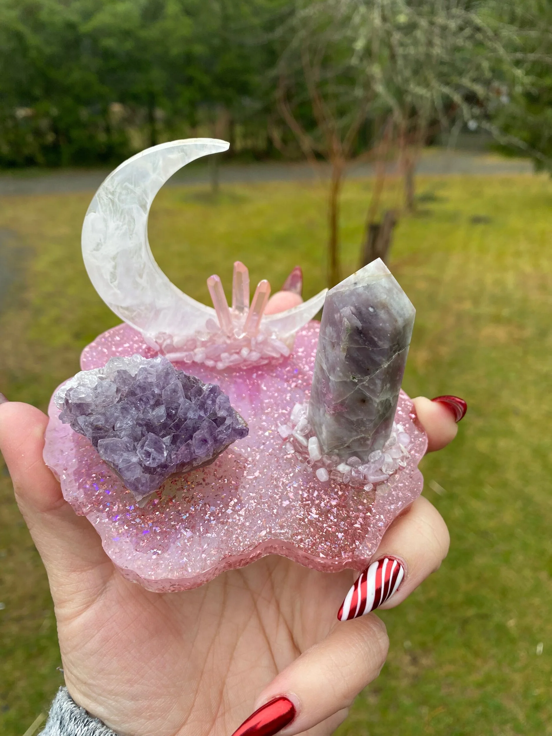 With an amethyst cluster, pink aura quartz points and chips of rose quartz, clear Quartz and kunzite