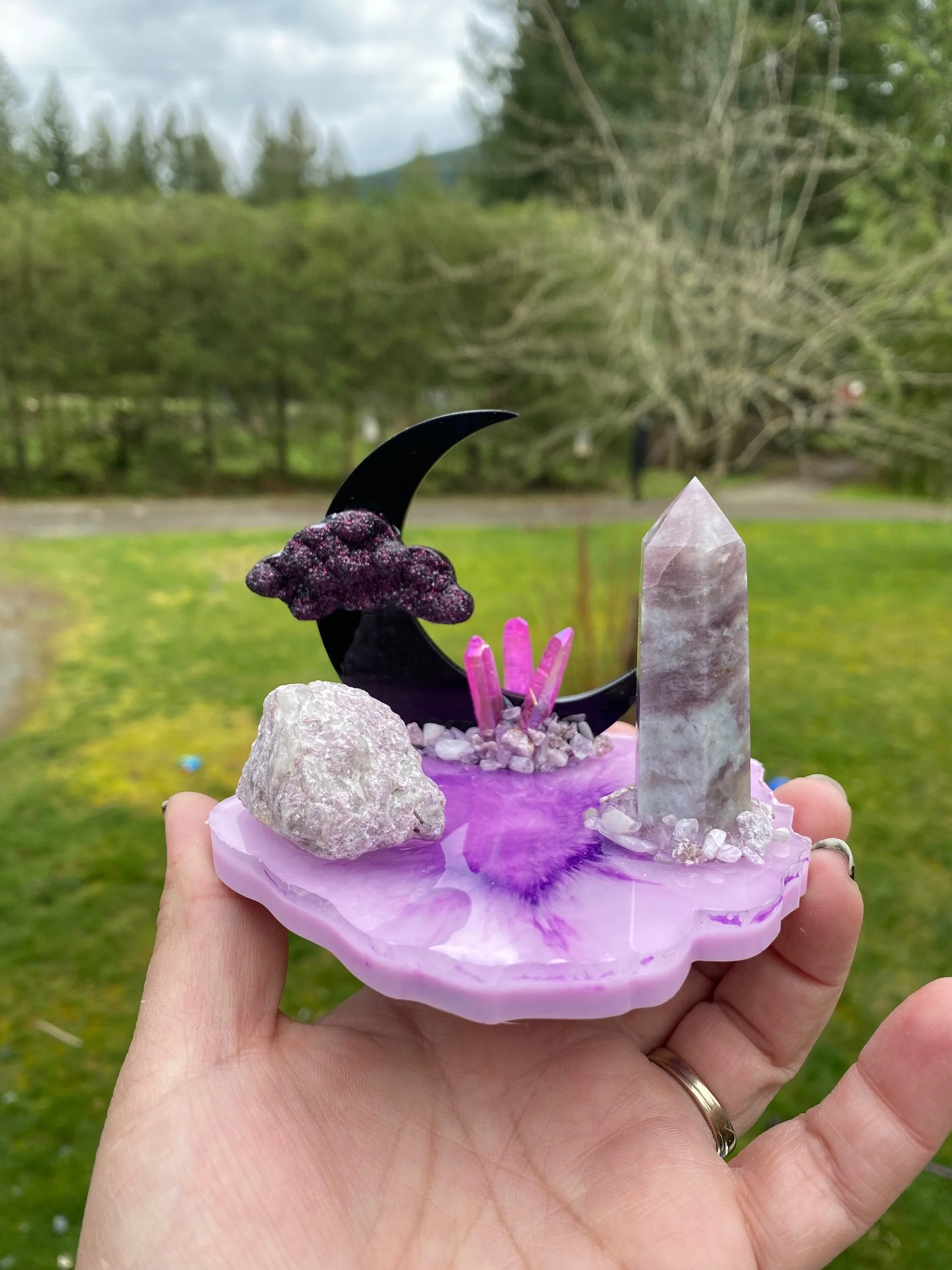 With Lepidolite, purple aura points and chips of kunzite, lepidolite and amethyst