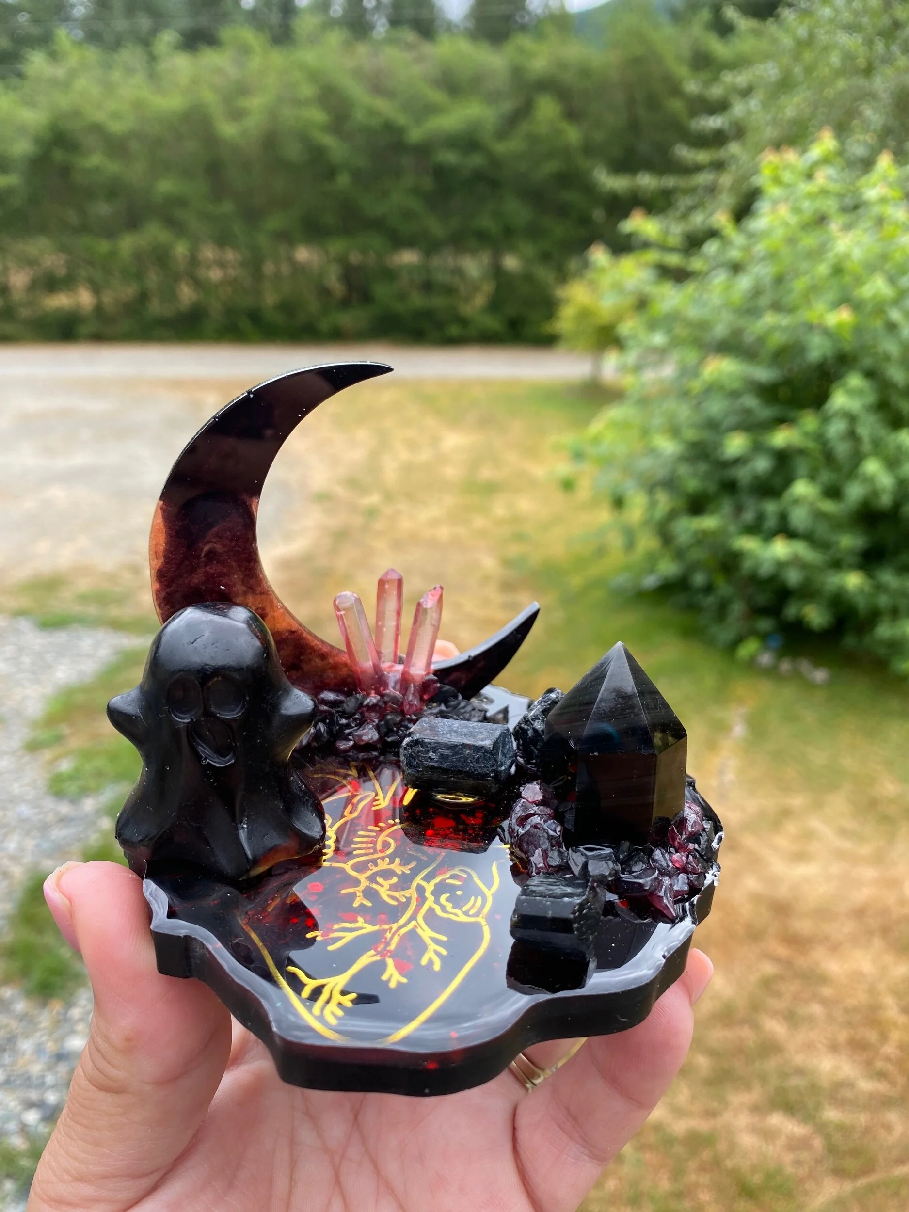 With an obsidian tower, raw black tourmaline, red aura quartz points and chips of garnet and obsidian.