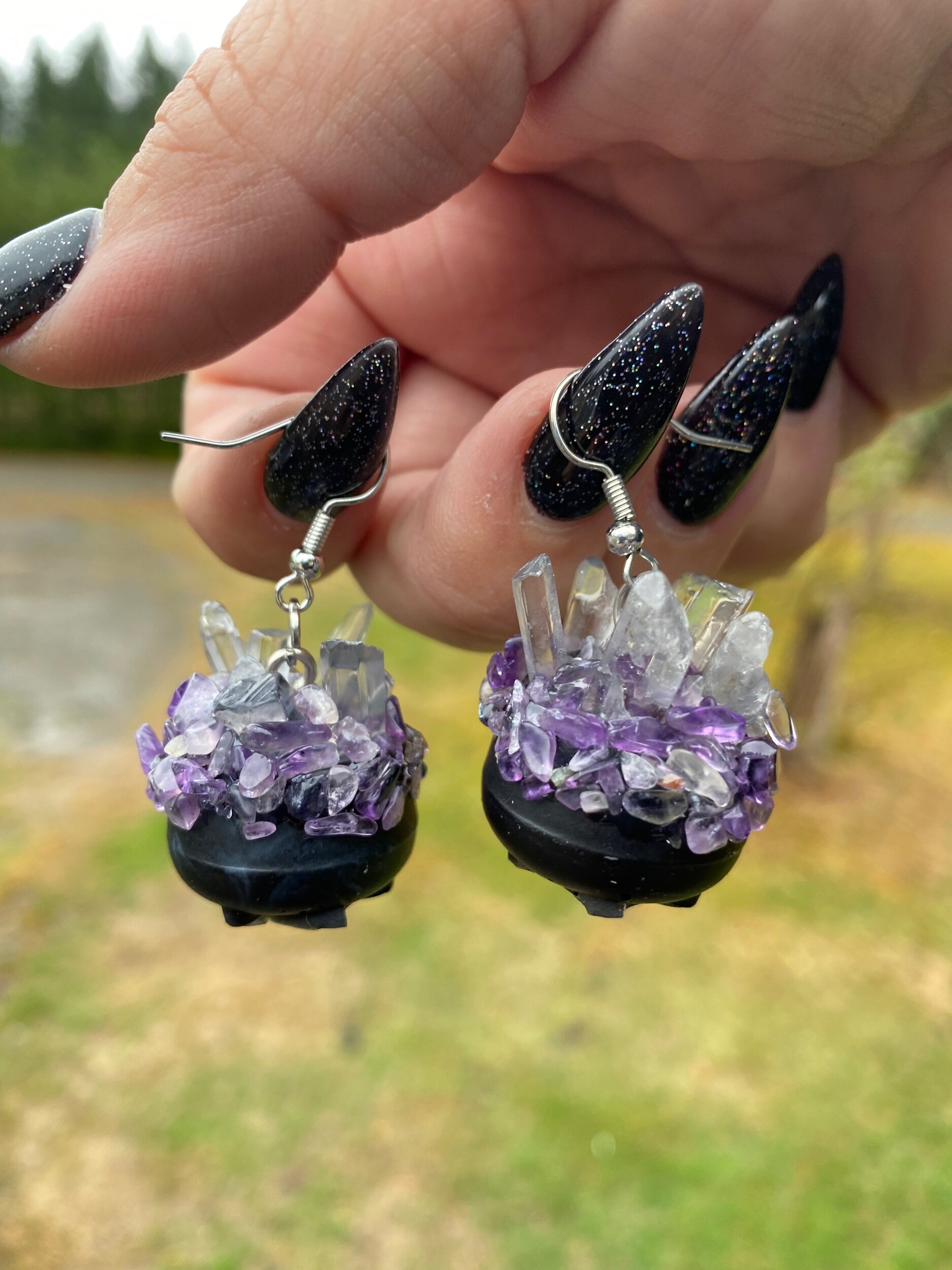 Shop › Crystal Bubbling Cauldron Earrings Image 1 of 1 Crystal Bubbling Cauldron Earrings $30.00 Sold Out With Quartz points and amethyst (these are not my usual metal cauldrons, these are handmade and lightweight) Sold Out Added! With Quartz points and amethyst (these are not my usual metal cauldrons, these are handmade and lightweight)