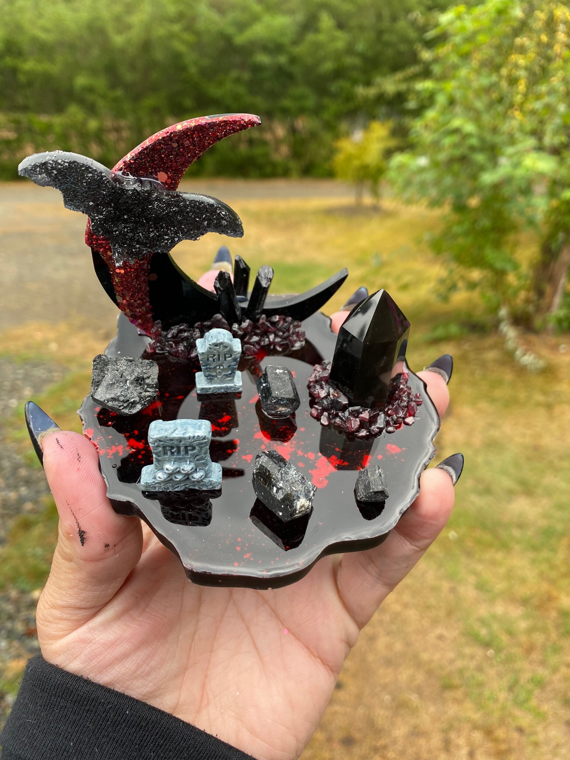 Shop › Halloween mini #14 Image 1 of 2 Image 2 of 2 Halloween mini #14 $69.00 Sold Out With a silver obsidian tower, obsidian points, garnet chips and raw black Tourmaline Sold Out Added! With a silver obsidian tower, obsidian points, garnet chips and raw black Tourmaline