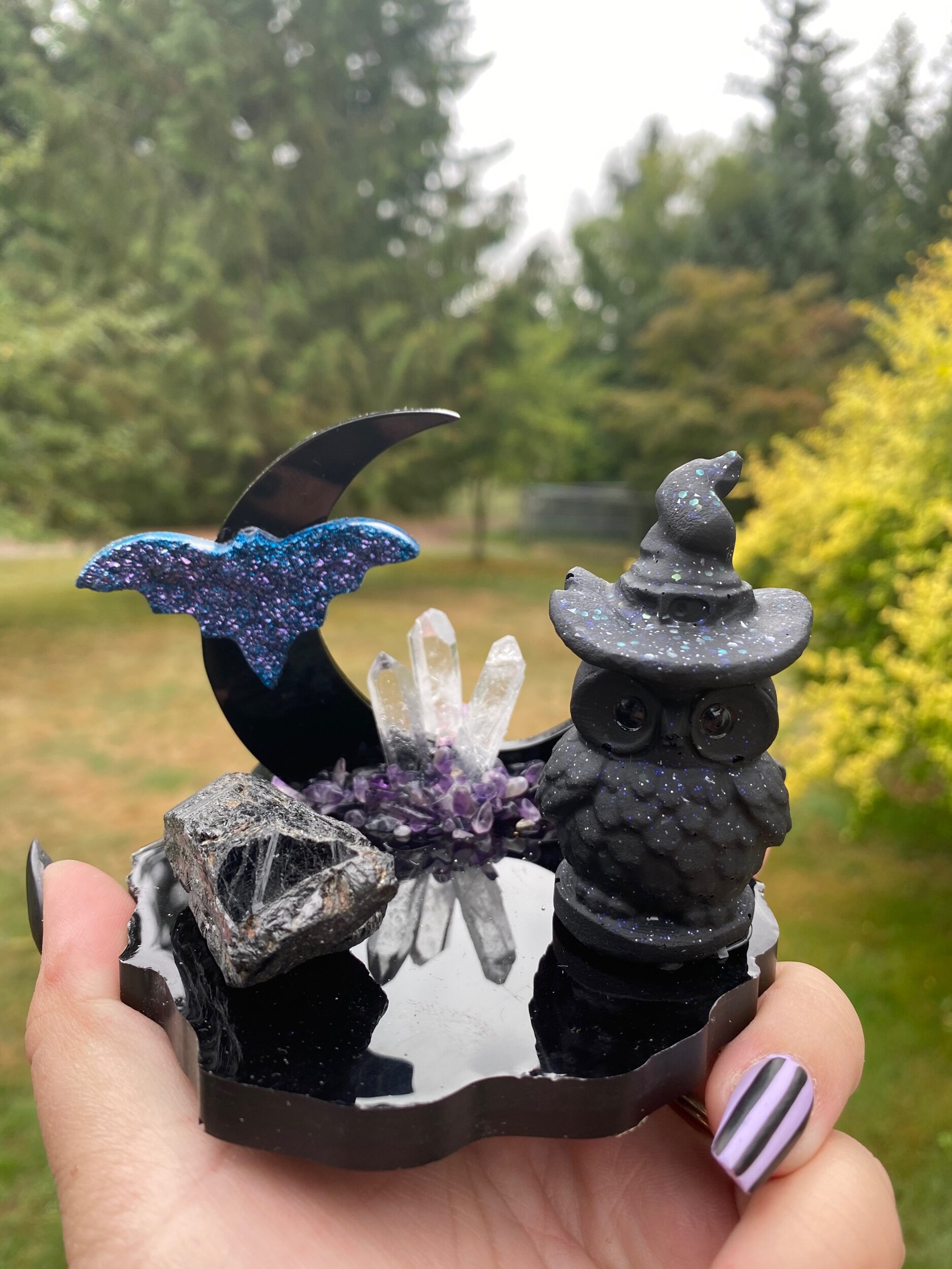 Shop › Mini moon with owl and black tourmaline Image 1 of 1 Mini moon with owl and black tourmaline $50.00 Sold Out With amethyst chips Sold Out Added! With amethyst chips