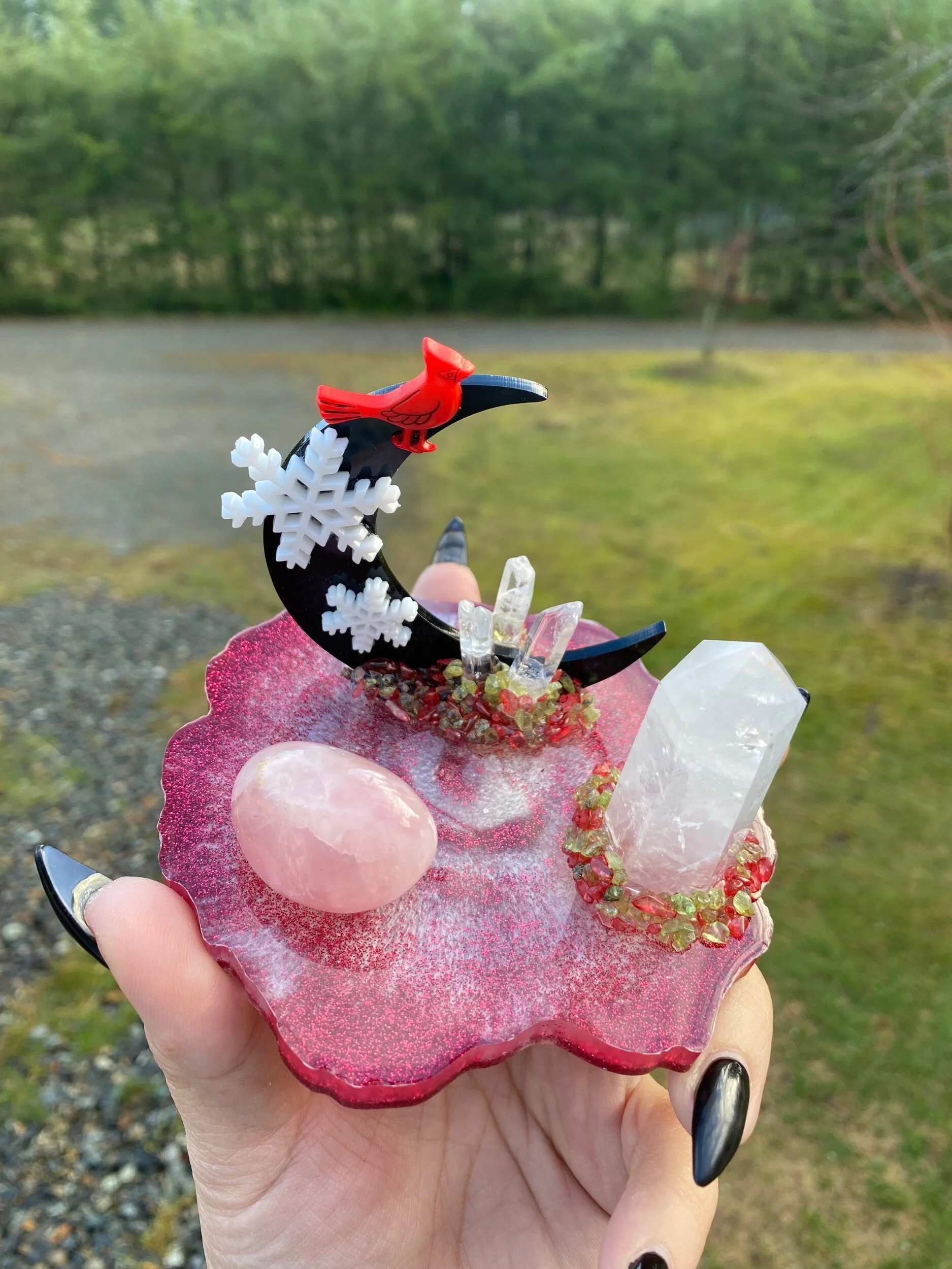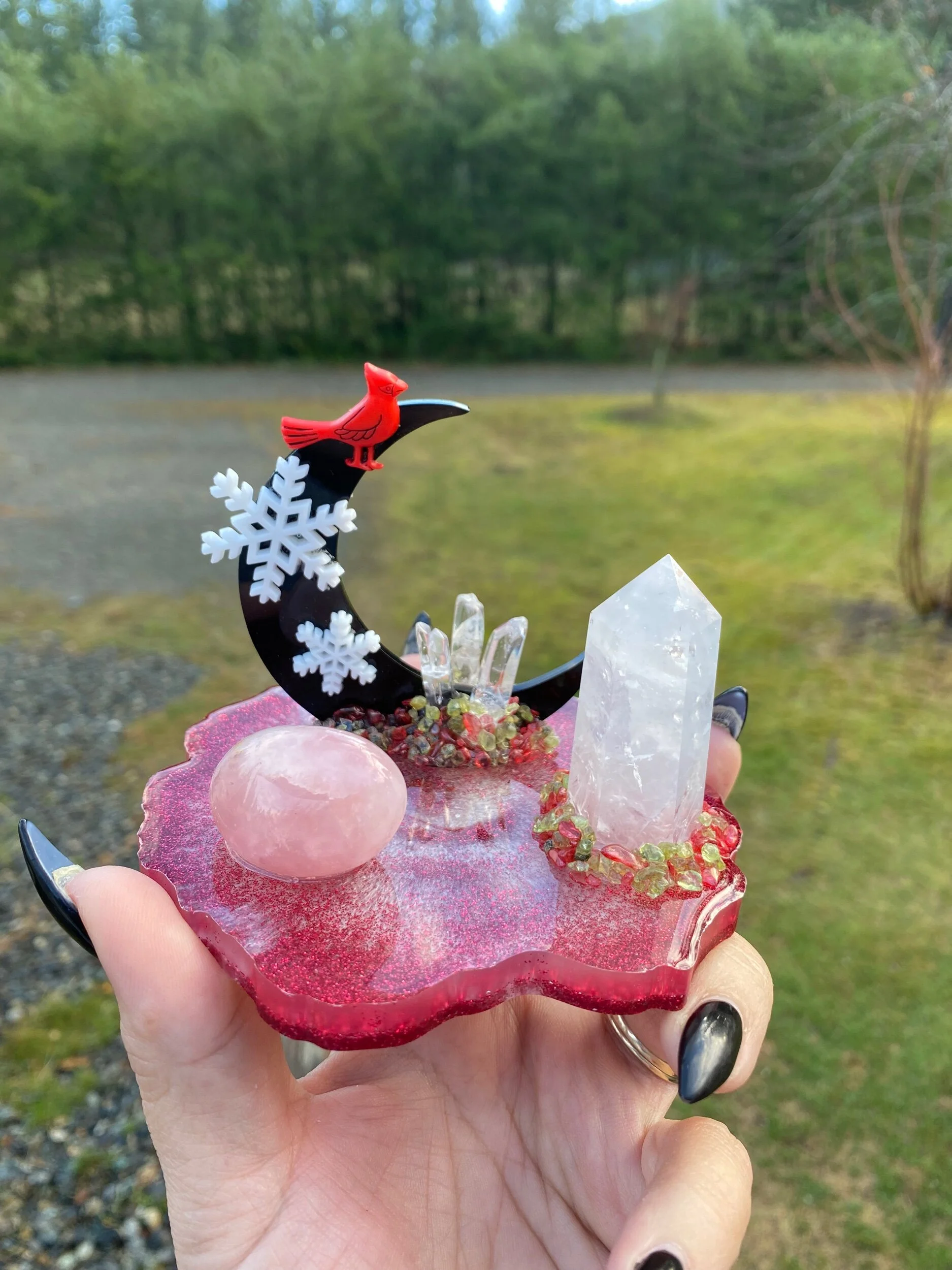 With a quartz tower, rose quartz tumble, quartz points and chips of peridot and dyed red quartz
