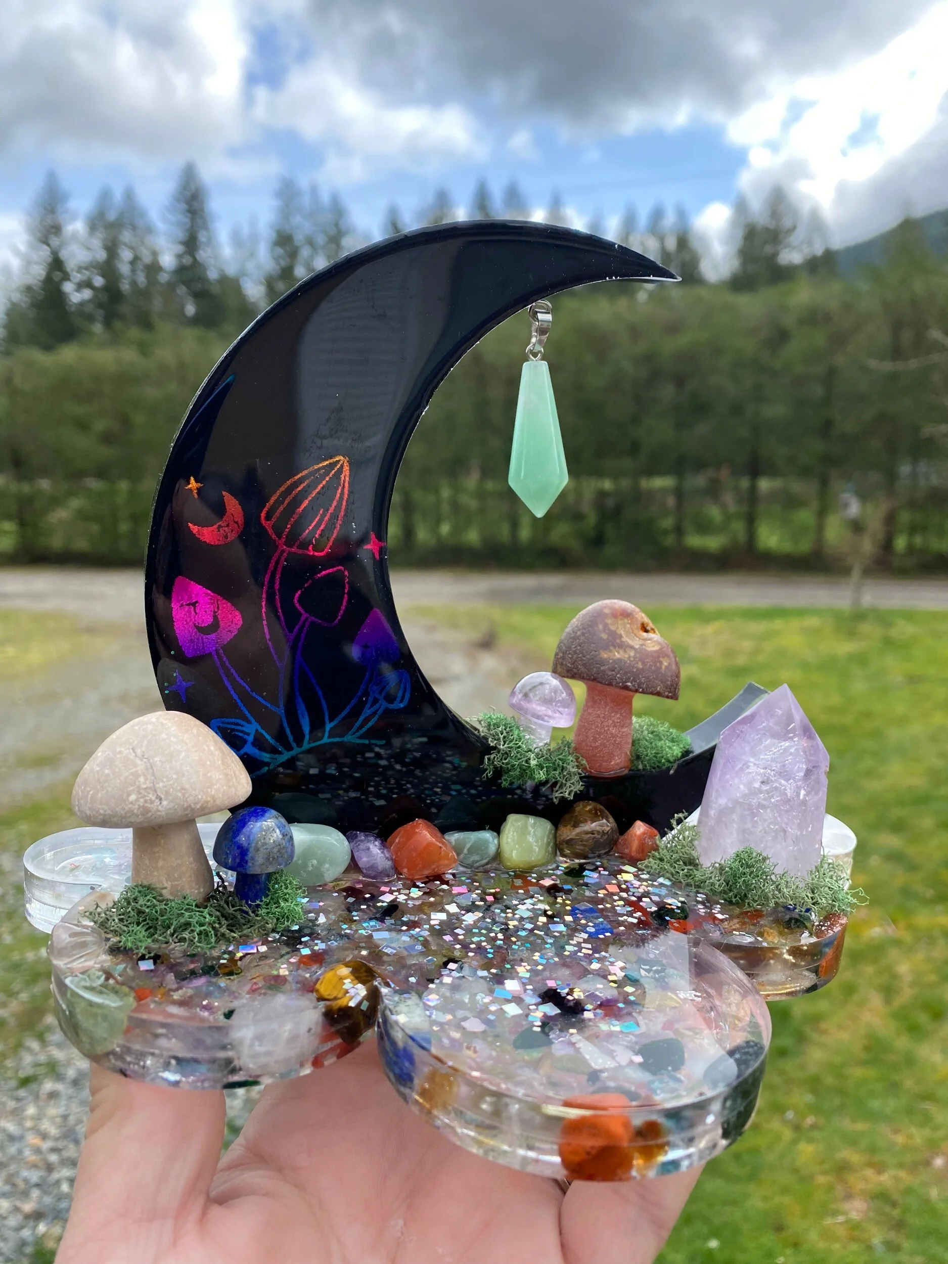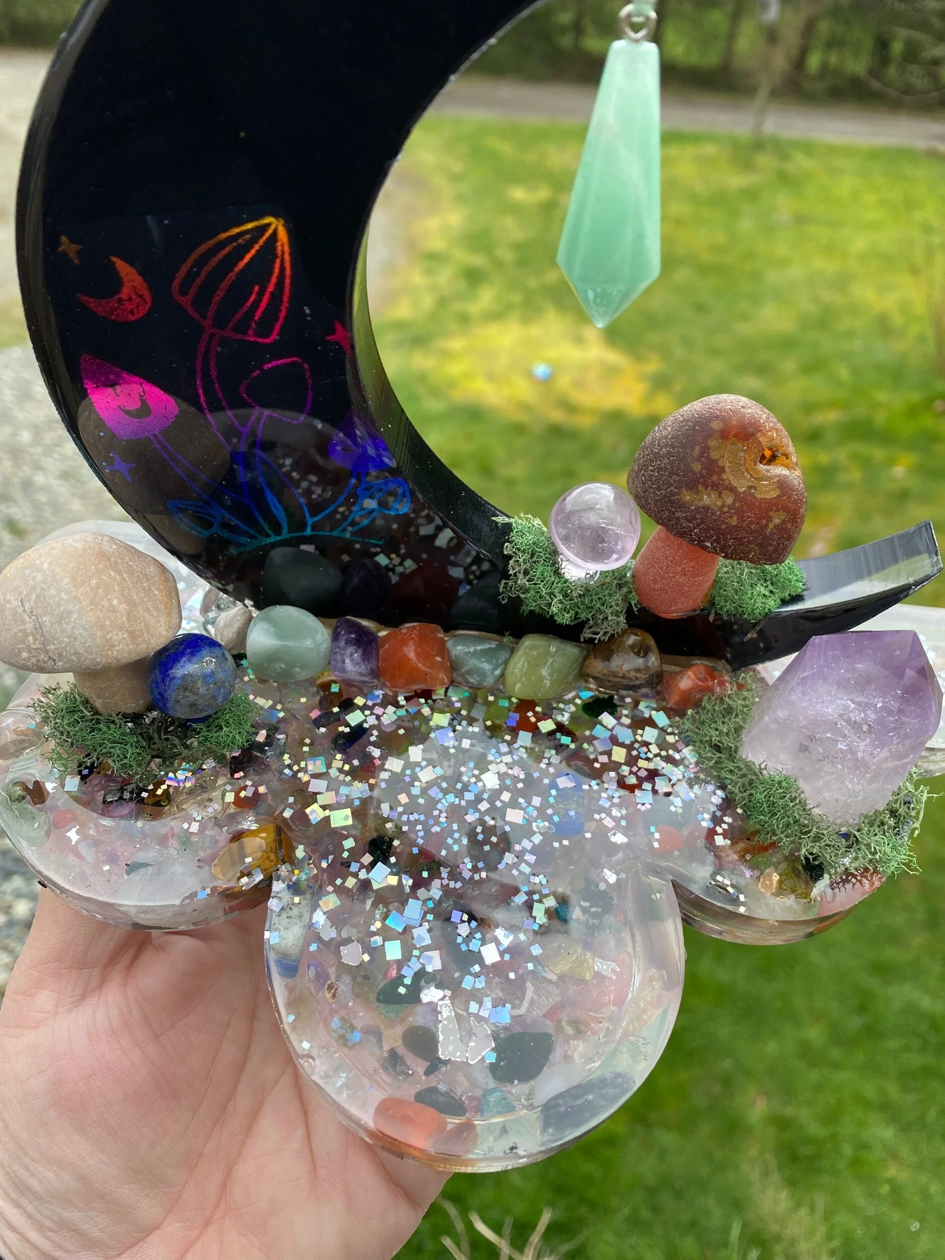 This moon is on a cloud base completely filled with crystal confetti. Many different crystals included. There are also agate mushrooms, Quartz mushroom amd lapis mushroom. Beautiful amethyst tower. Moss and a jade pendant.